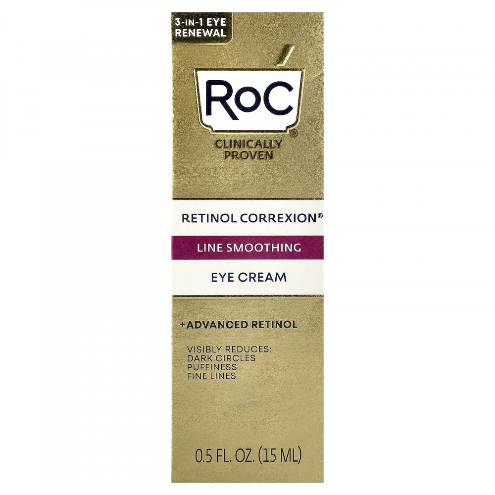 Устраните 3 признака старения глаз Устраните отечность, темные круги и морщины с помощью крема для кожи вокруг глаз RoC® Retinol Correxion®. Клинически доказано, что средство заметно омолаживает кожу вокруг глаз. Это средство, содержащее ретинол с медленным высвобождением и усилитель ретинола, обеспечивает максимальные результаты без раздражения. Этот легкий, быстро впитывающийся крем специально разработан для нежной области вокруг глаз.