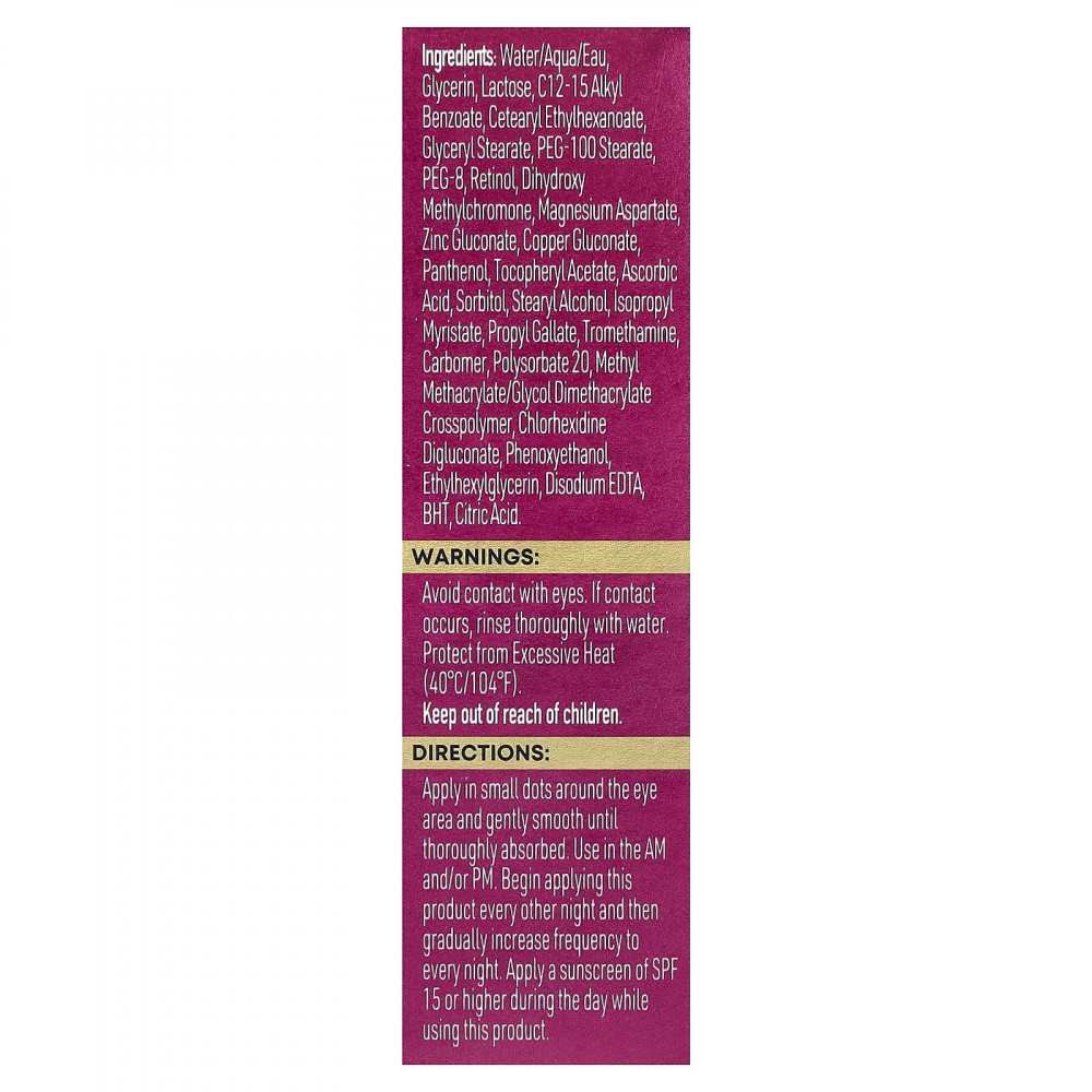 Наносите небольшими точечными движениями на область вокруг глаз и аккуратно разглаживайте до полного впитывания. Используйте утром и/или вечером. Начните наносить этот продукт через день, а затем постепенно увеличивайте частоту до каждого дня. Во время использования данного продукта наносите солнцезащитный крем с SPF 15 или выше в течение дня.