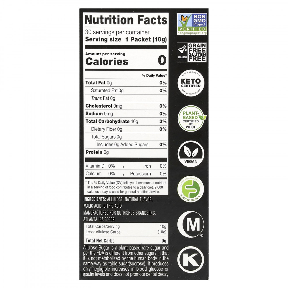 Аллулоза - это редкий сахар растительного происхождения, который, согласно FDA, отличается от других сахаров тем, что не метаболизируется в организме человека так же, как столовый сахар (сахароза). Он вызывает лишь незначительное повышение уровня глюкозы в крови или инсулина и не способствует разрушению зубов.