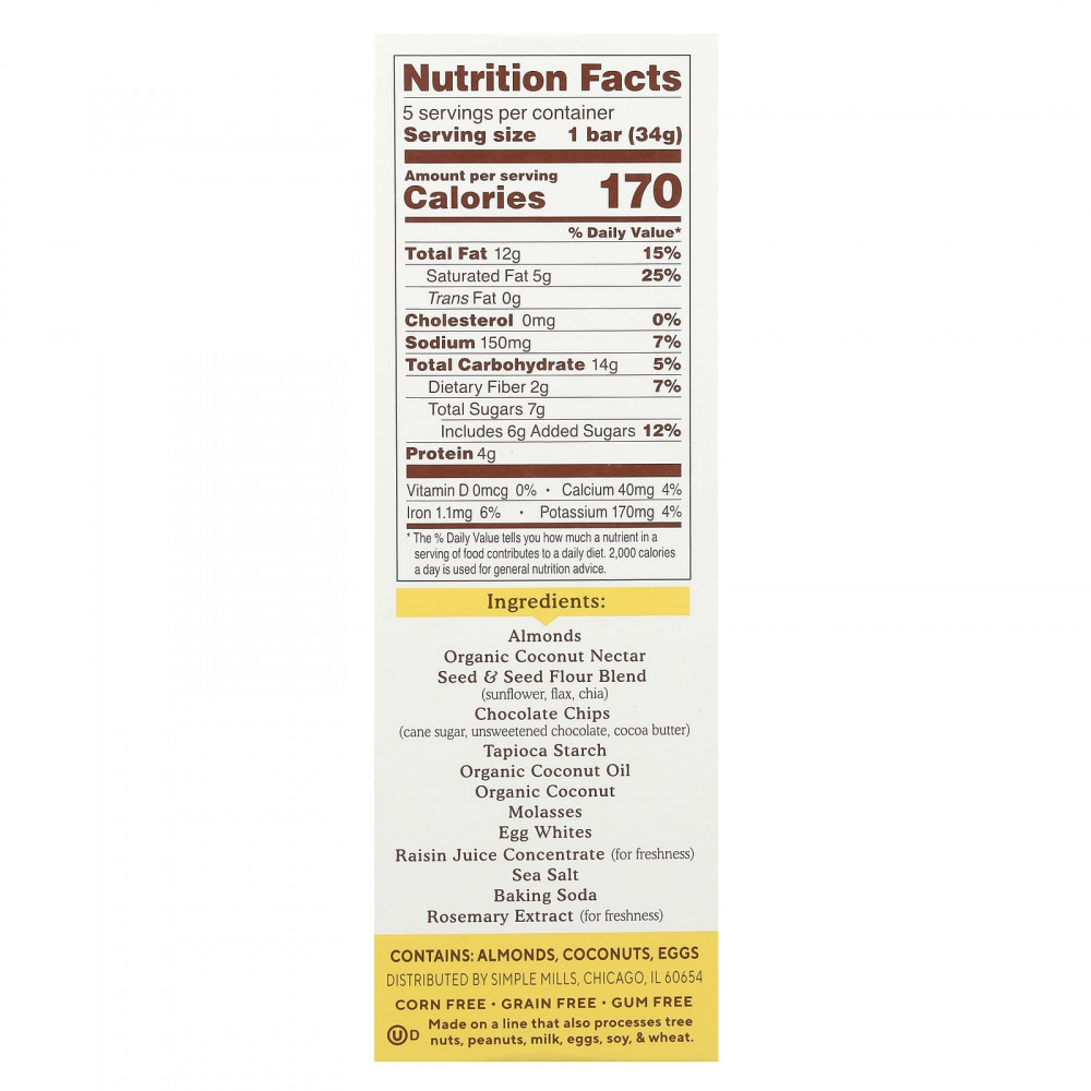 Миндаль, органический кокосовый нектар, смесь муки из семян (подсолнечника, льна, чиа), шоколадная крошка (тростниковый сахар, горький шоколад, какао-масло), тапиоковый крахмал, органическое кокосовое масло, органический кокос, патока, яичный белок, концентрат сока из изюма (для свежести), морская соль, пищевая сода, экстракт розмарина (для свежести).
