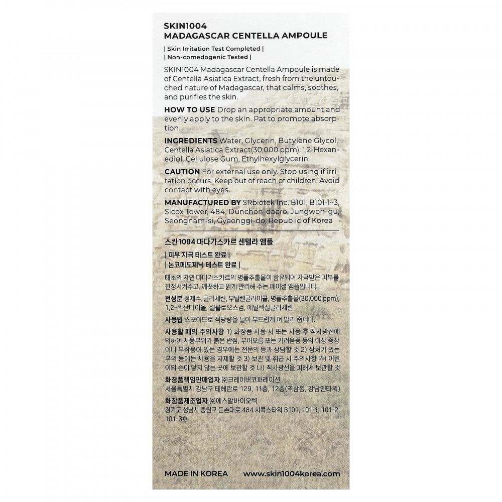 Сыворотка с мадагаскарской готу колой SKIN1004 содержит экстракт готу колы (Centella asiatica), полученный из нетронутой природы Мадагаскара, который успокаивает и очищает кожу.