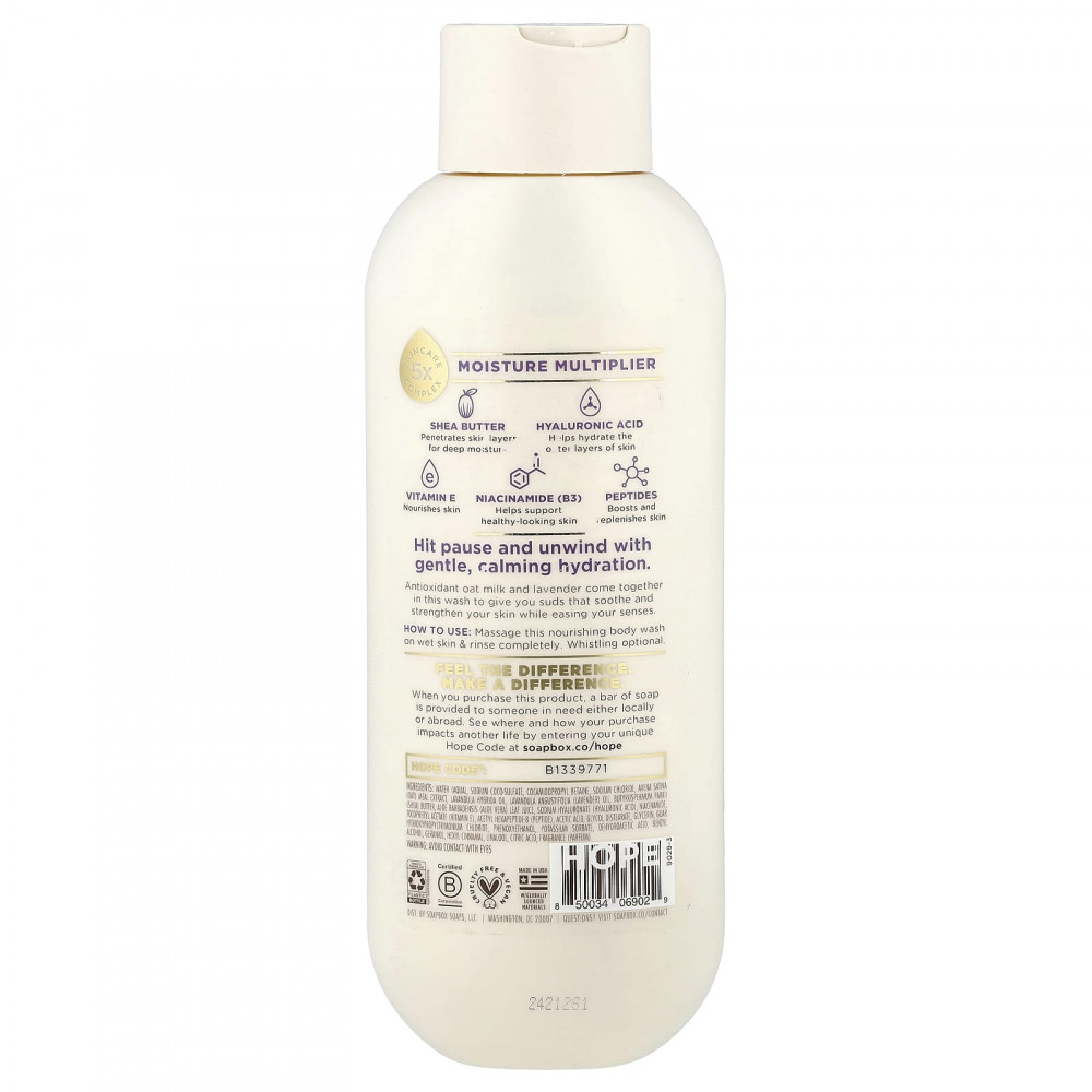 Вода, кокосульфат натрия, кокамидопропилбетаин, хлорид натрия, экстракт овсяной муки (Avena sativa), лавандовое масло (Lavandula hybrida), лавандовое масло (Lavandula angustifolia), масло ши (Butyrospermum parkii), сок листьев алоэ вера (Aloe barbadensis), гиалуронат натрия (гиалуроновая кислота), никотинамид, токоферилацетат (витамин Е), ацетил гексапептид-8 (пептид), уксусная кислота, гликоль дистеарат, глицерин, гуар гидроксипропилтримония хлорид, феноксиэтанол, сорбат калия, дегидроуксусная кислота, бензиловый спирт, гераниола, гексил циннамал, линалоол, лимонная кислота, отдушка (парфюмерная композиция).