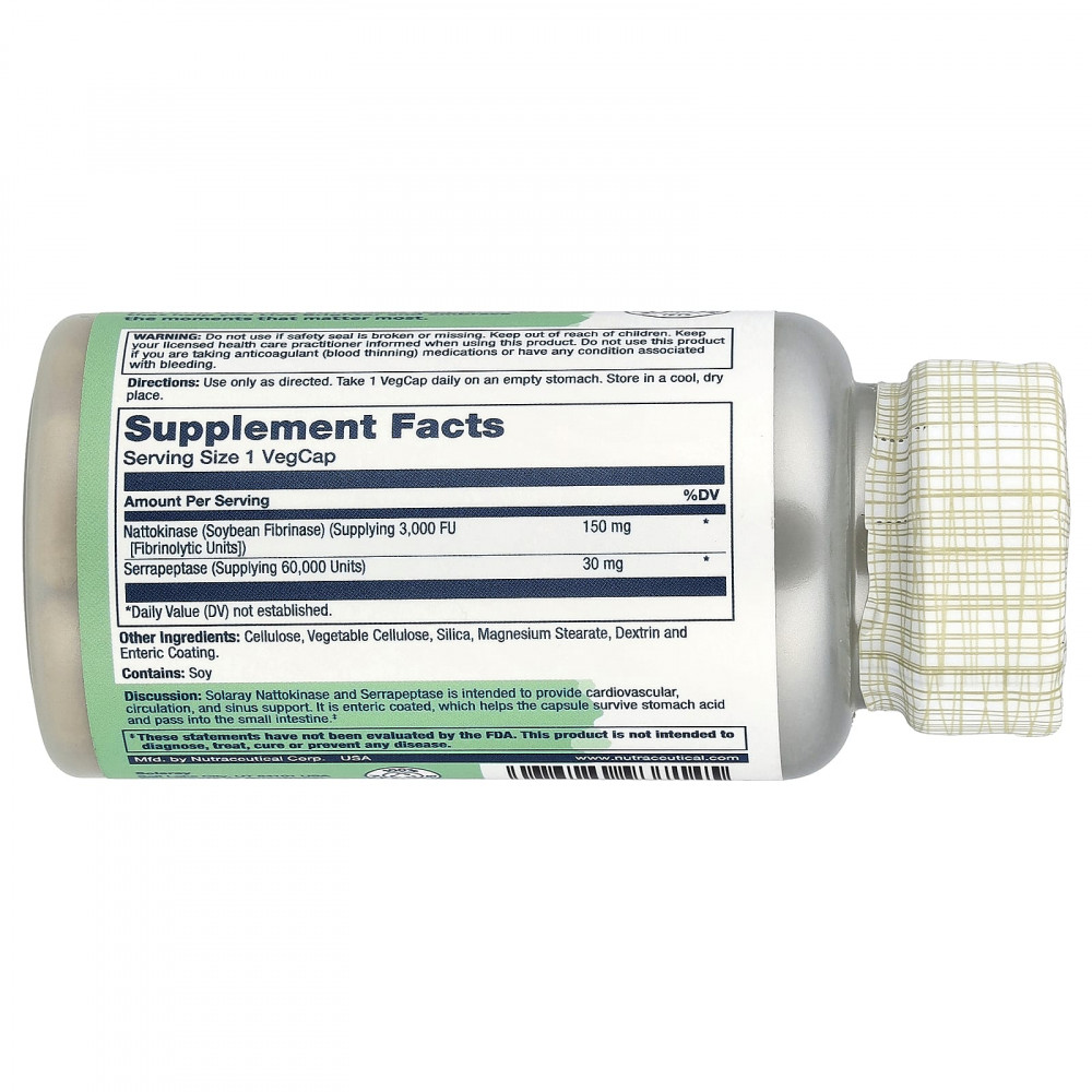 Описание. Наттокиназа и серрапептаза Solaray предназначены для поддержки сердечно-сосудистой системы, кровообращения и носовых пазух. Капсула покрыта кишечнорастворимой оболочкой, что помогает ей выдержать воздействие желудочного сока и достичь тонкого кишечника.