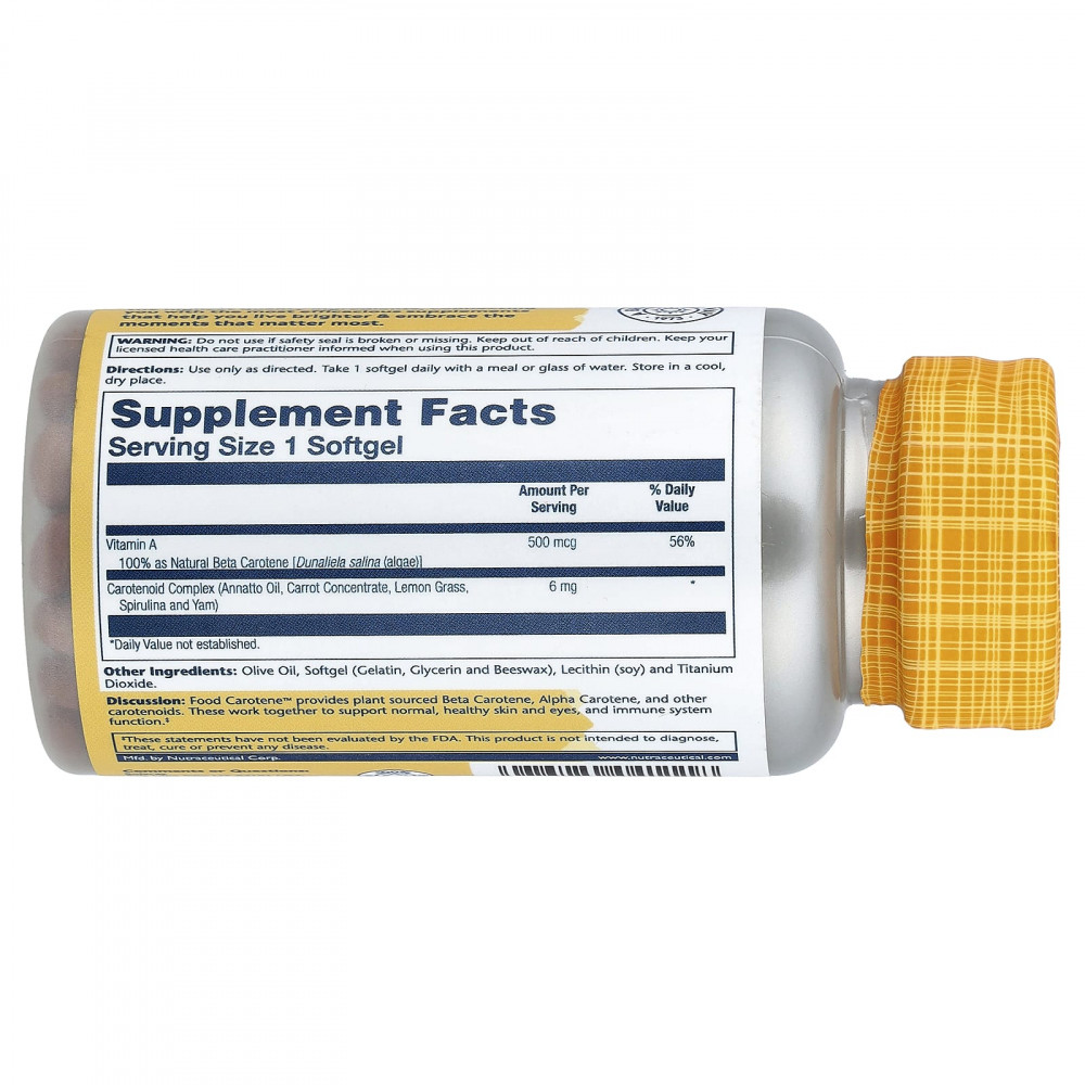 Описание. Food Carotene™ содержит бета-каротин, альфа-каротин и другие каротиноиды растительного происхождения. Вместе они поддерживают здоровье кожи и глаз, а также работу иммунной системы.