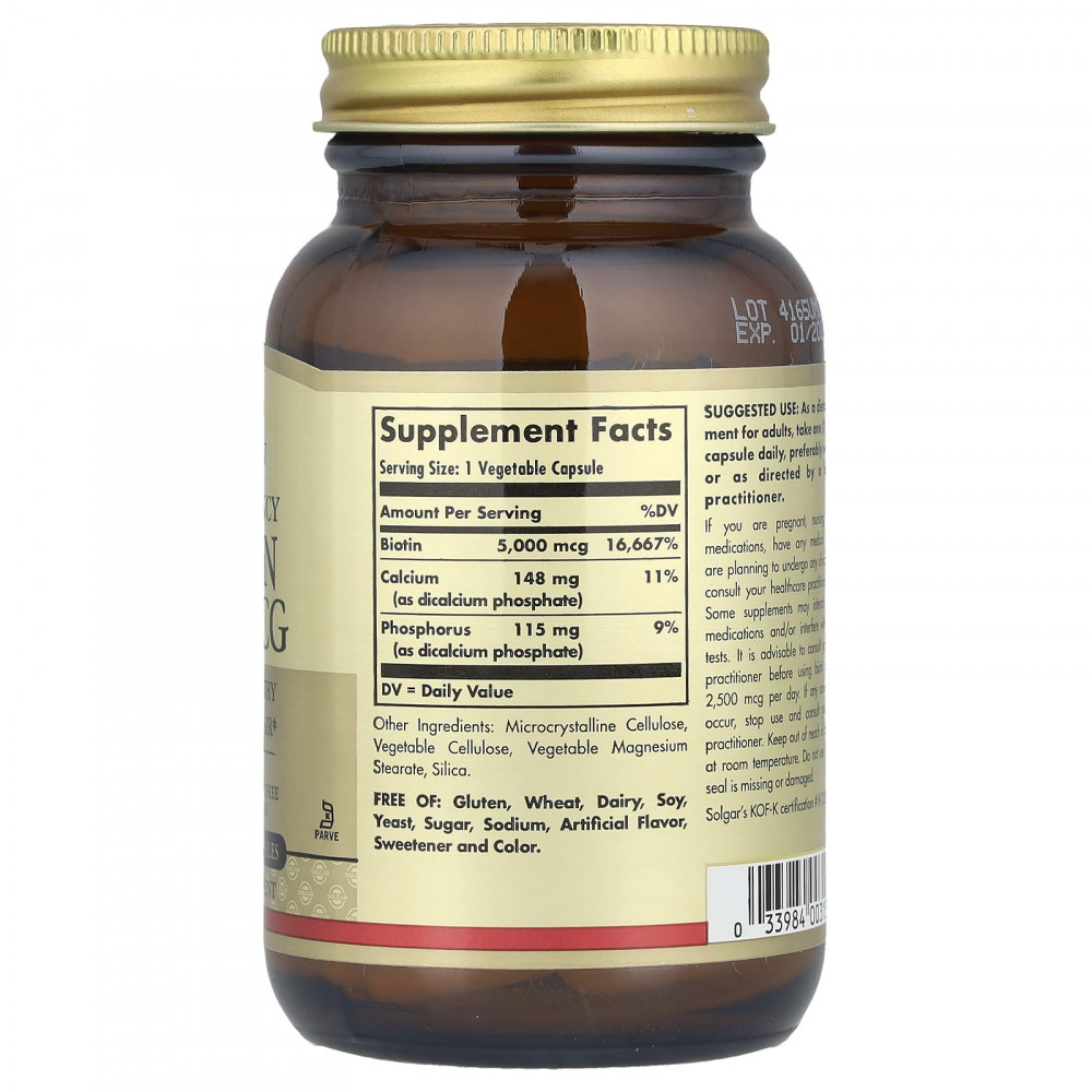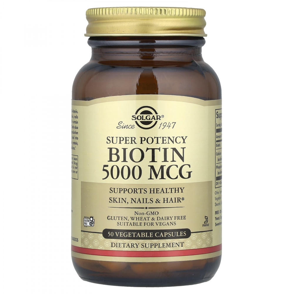 Биотин — это растворимый в воде витамин группы B. Он поддерживает здоровье кожи, ногтей и волос и необходим для правильной работы определённых ферментов. Биотин также поддерживает выработку клеточной энергии в организме, превращая пищу в энергию, и необходим для метаболизма белков, углеводов и жиров.
