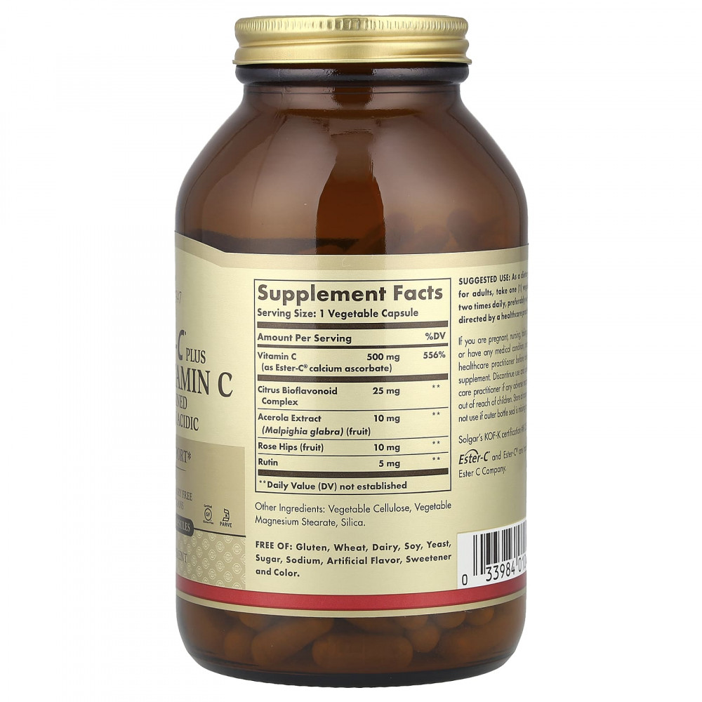 Ester-C® Plus — это эксклюзивная формула, разработанная компанией Solgar®, которая содержит уникальный витамин C Ester-C® с нейтральным уровнем pH (без повышенной кислотности), не вызывающий раздражения желудка. Метаболиты витамина C в составе Ester-C® способствуют удержанию витамина C в клетках, что приносит дополнительную пользу. Для формирования уникального комплекса метаболита аскорбата кальция используется особый производственный процесс. Этот хорошо усваиваемый комплекс также содержит натуральные биофлавоноиды, ягоды ацеролы и плоды шиповника.