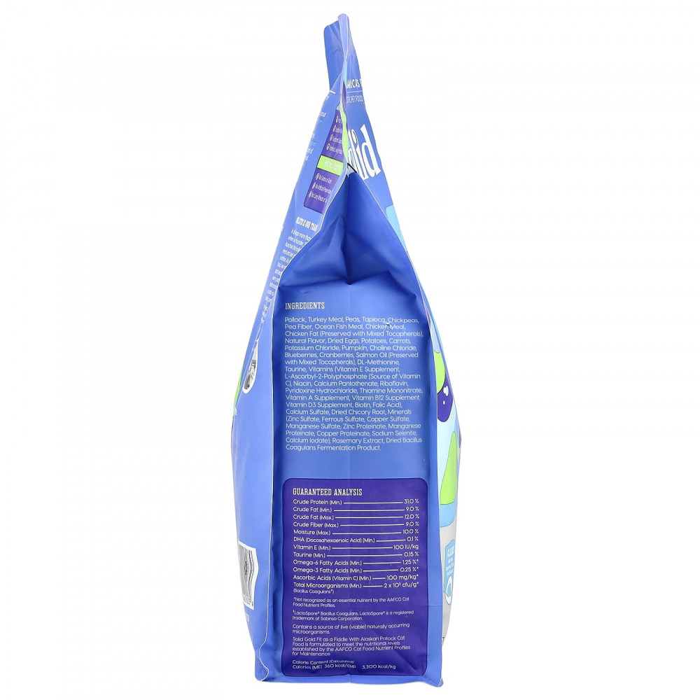 сайда, индейка, горох, тапиока, нут, гороховая клетчатка, мука из океанской рыбы, куриная мука, куриный жир (консервированный со смесью токоферолов), натуральный ароматизатор, сушеные яйца, картофель, морковь, хлорид калия, тыква, холин хлорид, голубика, клюква, лососевый жир (консервированный со смешанными токоферолами), dl-метионин, таурин, витамины (добавка с витамином Е, L-аскорбил-2-полифосфат (источник витамина C), ниацин, пантотенат кальция, рибофлавин, пиридоксина гидрохлорид, тиамина мононитрат, добавка с витамином А, добавка с витамином B12, добавка с витамином d3, биотин, фолиевая кислота), сульфат кальция, сушеный корень цикория, минералы (сульфат цинка, сульфат железа, сульфат меди, сульфат марганца, протеинат цинка, протеинат марганца, протеинат меди, селенит натрия, йодат кальция), экстракт розмарина, продукт ферментации сушеной палочки (Bacillus coagulans).