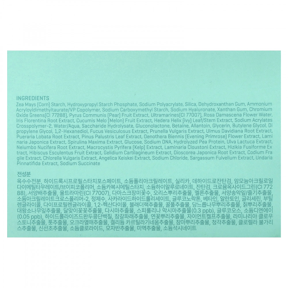 Кукурузный крахмал (Zea mays), гидроксипропил фосфат крахмала, полиакрилат натрия, диоксид кремния, дегидроксантановая камедь, аммоний акрилоилдиметилтаурат/ВП сополимер, карбоксиметил крахмал натрия, гиалуронат натрия, ксантановая камедь, хромовую зелень (CI 77288), экстракт плодов груши (Pyrus communis), ультрамарины (CI 77007), вода из цветков дамасской розы (Rosa damascena), экстракт корня ириса флорентийского, экстракт плодов дыни (Cucumis melo), экстракт листьев/стеблей плюща (Hedera helix), акрилат натрия кроссполимер-2, вода/аква, сахарида гидролизат, глюконолактон, бетаин, аллантоин, глицерин, бутиленгликоль, дипропиленгликоль, 1,2-гександиол, экстракт фукуса (Fucus vesiculosus), экстракт сливы (Prunella vulgaris), экстракт корня вяза Давида (Ulmus davidiana), экстракт корней пуэрарии дольчатой (Pueraria lobata), экстракт хвои сосны болотной (Pinus palustris), экстракт цветков примулы вечерней (Oenothera biennis), экстракт ламинарии японской (Laminaria japonica), экстракт спирулины (Spirulina maxima), глюкоза, ДНК натрия, гидролизованный гороховый белок, экстракт ульвы латука (Ulva lactuca), экстракт корня (Nelumbo nucifera), экстракт макроцистиса грушевидного (Macrocystis pyrifera), экстракт ламинарии Клоустона (Laminaria cloustoni), экстракт хидзики (Hizikia fusiforme), экстракт плодов гибискуса (Hibiscus esculentus), экстракт агарофита (Gelidium cartilagineum), экстракт корня диоскореи японской (Dioscorea japonica), экстракт кодиума (Codium fragile), экстракт хлореллы (Chlorella vulgaris), экстракт дудника (Angelica keiskei), хлорид натрия, экстракт саргассума (Sargassum fulvellum), экстракт ундарии перистой (Undaria pinnatifida), сукцинат натрия.