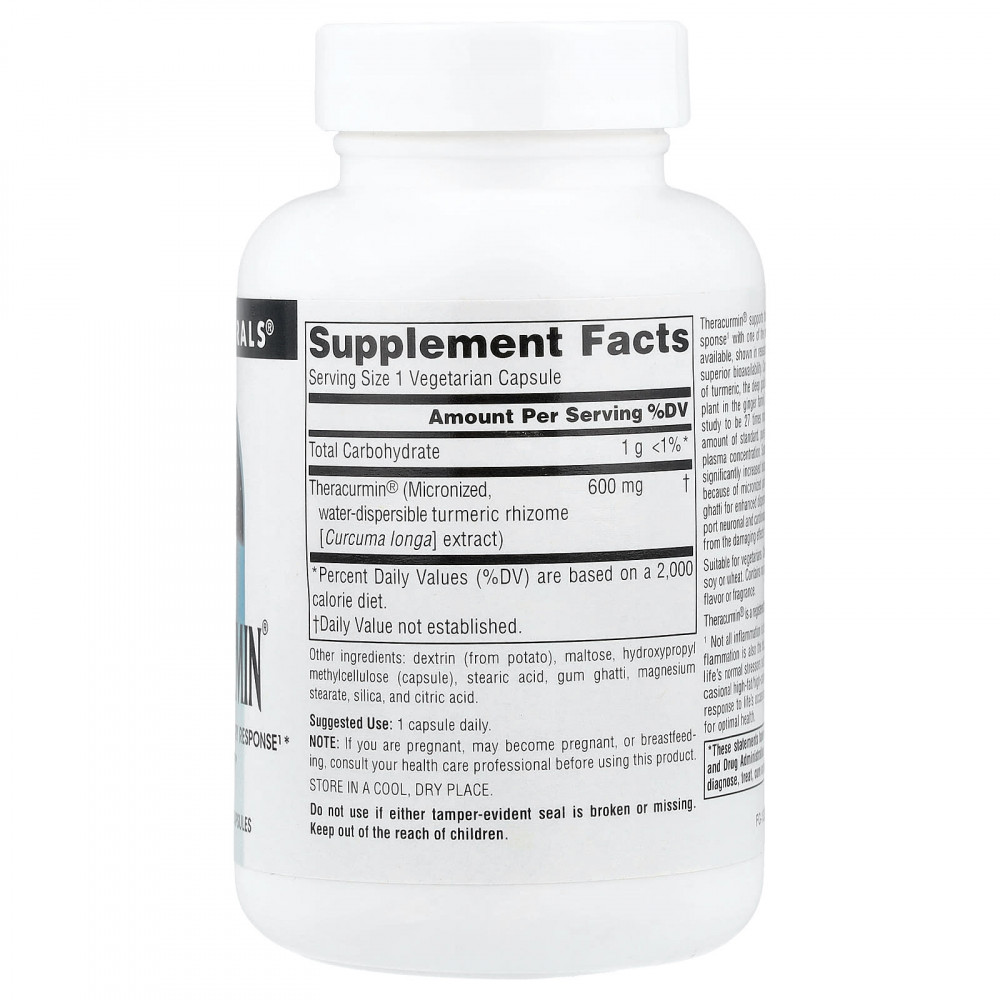 Theracurmin® поддерживает здоровую воспалительную реакцию организма¹ благодаря одной из самых передовых форм куркумина, которая, как показали исследования, обеспечивает более быстрое растворение и превосходную биодоступность. Куркумин — важный компонент куркумы, золотой специи с насыщенным вкусом, получаемой из корневища растения из семейства имбирных. В одном исследовании было показано, что Theracurmin® в 27 раз более биодоступен, чем эквивалентное количество стандартного, чистого куркумина, что определяется по концентрации в плазме крови. Theracurmin® от Source Naturals имеет значительно повышенную биодоступность по сравнению со стандартом, содержащимся в экстракте хумга (Hum ighatti), для лучшего растворения в кишечнике. Куркумин может поддерживать здоровье нервной и сердечно-сосудистой систем, а также помогает защитить клетки от вредного воздействия свободных радикалов.