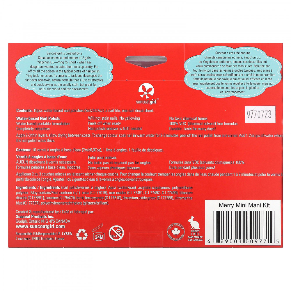 Продукт Suncoatgirl был создан канадским химиком и мамой двух девочек Инчун Лю (или просто Инь), когда ее дочери захотели накрасить ногти. Сочтя неприемлемым использование ядовитых ингредиентов, составляющих содержимое типичной бутылочки лака для ногтей, Инь воспользовалась своими научными знаниями и разработала первый в истории нетоксичный натуральный состав лака для ногтей, который обладает таким же эффектом и сохнет так же быстро, как и обычные лаки с сильным запахом, но не вредит ногтям, планете и окружающей среде.