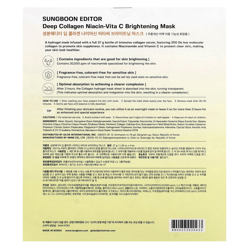 Гидрогелевая маска, наполненная полным флаконом 37 г интенсивной коллагеновой сыворотки, содержащей низкомолекулярный коллаген 200 Да для повышения эластичности кожи. Он содержит ниацинамид и витамин С, которые делают кожу более чистой, делая ее более здоровой.