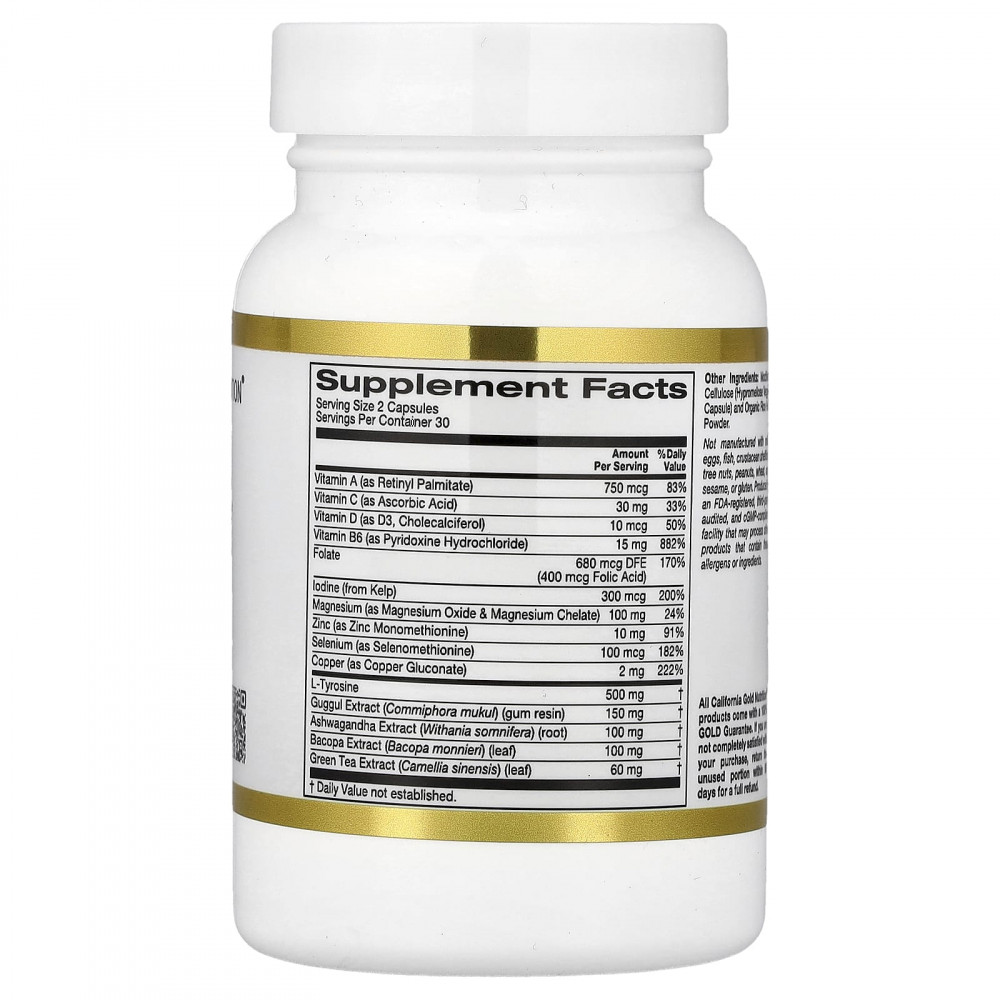 Витамин A (в виде ретинилпальмитата), витамин С (в виде аскорбиновой кислоты), витамин D (в виде витамина D3, холекальциферола), Витамин В6 (в виде пиридоксина гидрохлорида), Фолат, Йод (из бурых водорослей), Магний (в виде оксида магния и хелата магния), Цинк (в виде монометионина цинка), Селен (в виде селенометионина), Медь (в виде глюконата меди), L-тирозин, Экстракт гуггула (Commiphora mukul) (смола камеди), Экстракт корня ашваганды (Withania somnifera)., Экстракт бакопы (Bacopa monnieri) (лист), Экстракт зеленого чая (Camellia sinensis) (лист)