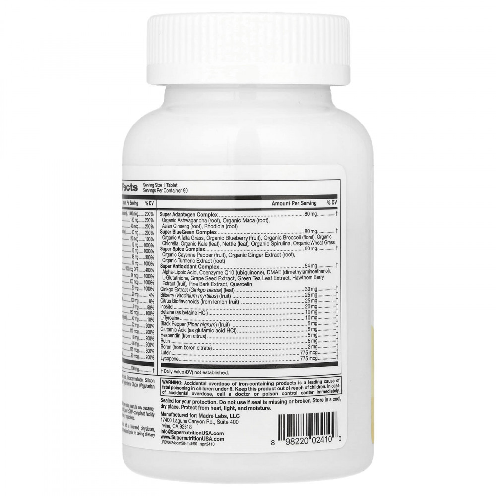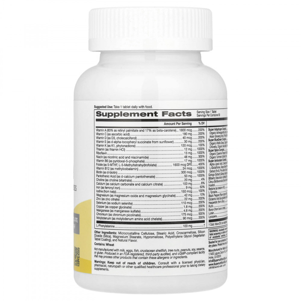 Витамин A (83% в виде ретинилпальмитата и 17% в виде бета-каротина), витамин C (в виде аскорбиновой кислоты), витамин D (в виде витамина D3, холекальциферол), витамин E (в виде d-альфа токоферил сукцината из подсолнечника), витамин K (в виде витамина K1, фитонадиона), тиамин (в виде тиамина гидрохлорида), рибофлавин, ниацин (в виде никотиновой кислоты и никотинамида), витамин B6 (в виде пиридоксаль-5-фосфата), фолат (в виде 5-MTHF, L-5-метилтетрагидрофолата), витамин B12 (в виде метилкобаламина), биотин (в виде d-биотина), пантотеновая кислота (в виде d-пантотената кальция), холин (в виде холина битартрата), кальций (в виде карбоната кальция и цитрата кальция), железо (в виде ферронилового железа), йод (из келпа), магний (в виде оксида магния и глицината магния), цинк (в виде цитрата цинка), селен (в виде селенита натрия), медь (в виде глицината меди), марганец (в виде сульфата марганца), хром (в виде пиколината хрома), молибден (в виде аминокислотного хелата молибдена), комплекс Super Adaptogen (адаптогены): корень органической ашваганды, корень органической маки, корень женьшеня азиатского, корень родиолы; комплекс Super BlueGreen (сине-зелёные растительные ингредиенты): ростки органической люцерны, ягоды органической голубики, соцветия органической брокколи, органическая хлорелла, листья органической кудрявой капусты, листья крапивы, органическая спирулина, ростки органической пшеницы; комплекс Super Spice (специи): плоды органического кайенского перца, экстракт корня органического имбиря, экстракт корня органической куркумы; комплекс Super Antioxidant (антиоксиданты): альфа-липоевая кислота, коэнзим Q10 (убихинон), ДМАЭ (диметиламиноэтанол), L-глутатион, экстракт виноградных косточек, экстракт листьев зелёного чая, экстракт ягод боярышника, экстракт сосновой коры, кверцетин, экстракт листьев гинкго билоба, ягоды черники (Vaccinium myrtillus), цитрусовые биофлавоноиды (из плодов лимона), инозитол, бетаин (в виде гидрохлорида бетаина), L-тирозин, плоды чёрного перца (Piper nigrum), глутаминовая кислота (в виде гидрохлорида глутаминовой кислоты), гесперидин (из цитрусов), рутин, бор (из цитрата бора), лютеин, ликопин.