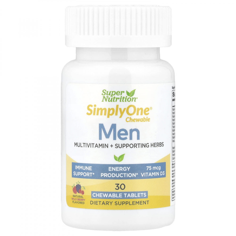 Мультивитамины и полезные травы для мужчин SimplyOne от Super Nutrition содержат смесь витаминов, минералов и растительных компонентов в удобной жевательной таблетке с натуральным вкусом лесных ягод. Продукт не содержит глютена и ГМО.