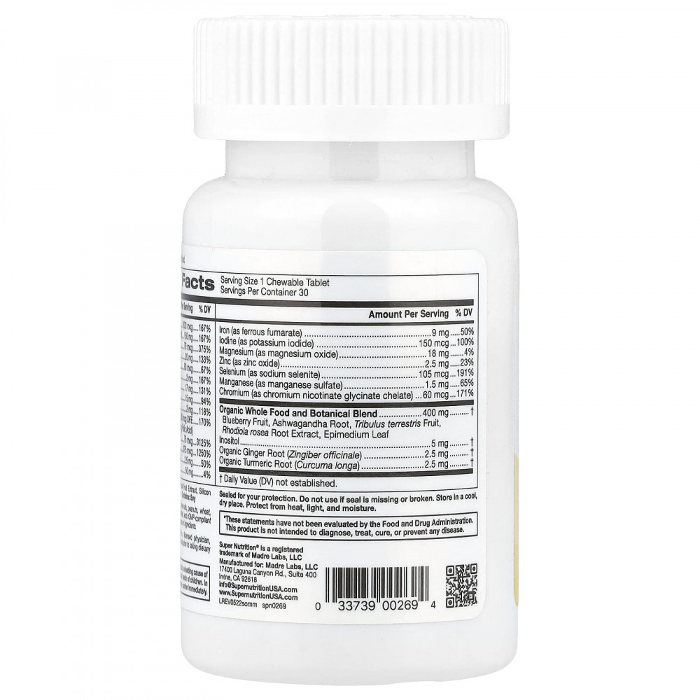Витамин A (в виде ретинилпальмитата), витамин С (в виде аскорбата натрия и аскорбиновой кислоты), витамин D (в виде D3, холекальциферола), витамин E (в виде d-альфа токоферил сукцината), витамин K (в виде витамина K1, фитонадиона), тиамин (в виде тиамина гидрохлорида), рибофлавин, ниацин (в виде никотинамида), витамин B6 (в виде пиридоксина гидрохлорида), фолат (400 мкг фолиевой кислоты), витамин B12 (в виде метилкобаламина), биотин (в виде d-биотина), пантотеновая кислота (в виде d-пантотената кальция), кальций (в виде карбоната кальция), железо (в виде фумарата железа), йод (в виде йодида калия), магний (в виде оксида магния), цинк (в виде оксида цинка), селен (в виде селенита натрия), марганец (в виде сульфата марганца), хром (в виде хрома никотината глицината хелата), смесь органических цельных продуктов и растительных компонентов (плоды голубики, корень ашваганды, плоды якорцев стелющихся (Tribulus terrestris), экстракт корня родиолы розовой [Rhodiola rosea], листья горянки), инозитол, корень органического имбиря (Zingiber officinale), корень органической куркумы (Curcuma longa).