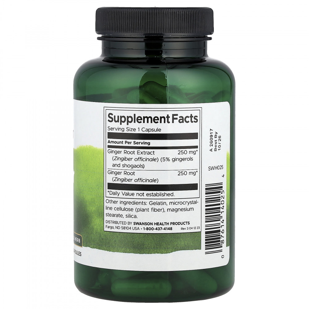 Успокойте свой желудок с имбирем Swanson! Успокаивающие свойства имбиря делают его полезным, когда желудку нужно немного успокоить. Наши удобные капсулы содержат 250 мг экстракта имбиря с гарантированной эффективностью (стандартизированный до 5% гингеролов и шогаолов) с 250 мг сушеного корня имбиря.