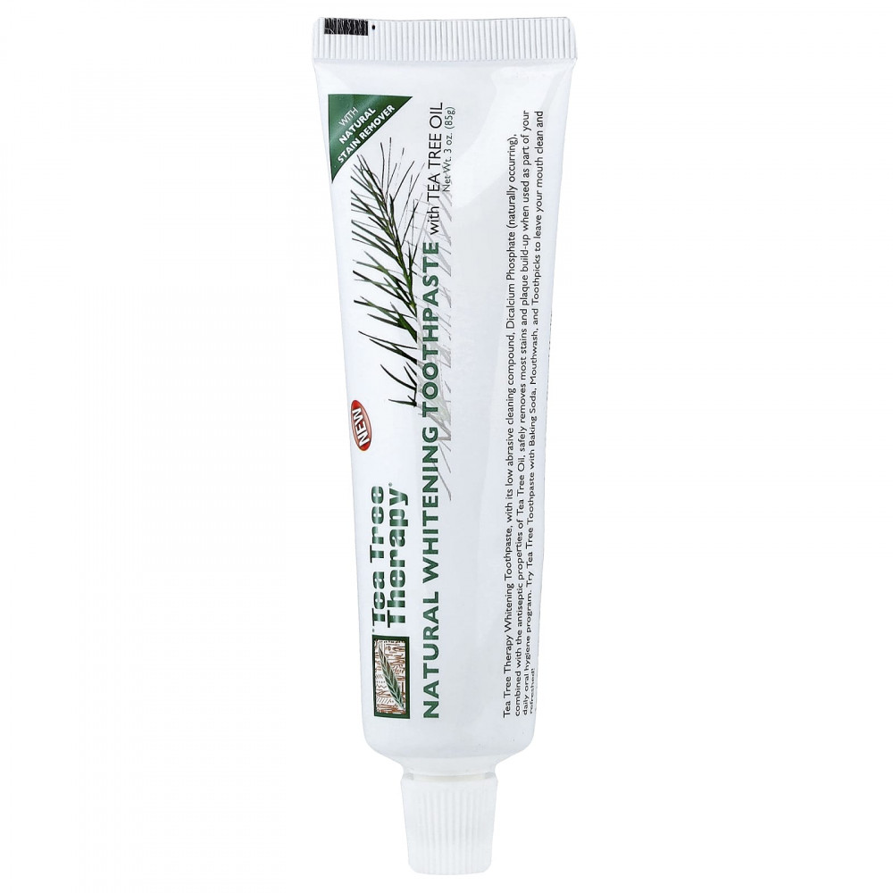 Отбеливающая зубная паста Tea Tree Therapy с низкоабразивным очищающим средством, дикальцийфосфатом (природного происхождения) в сочетании с антисептическими свойствами масла чайного дерева безопасно удаляет большинство пятен и налета при использовании в рамках ежедневной программы гигиены полости рта.