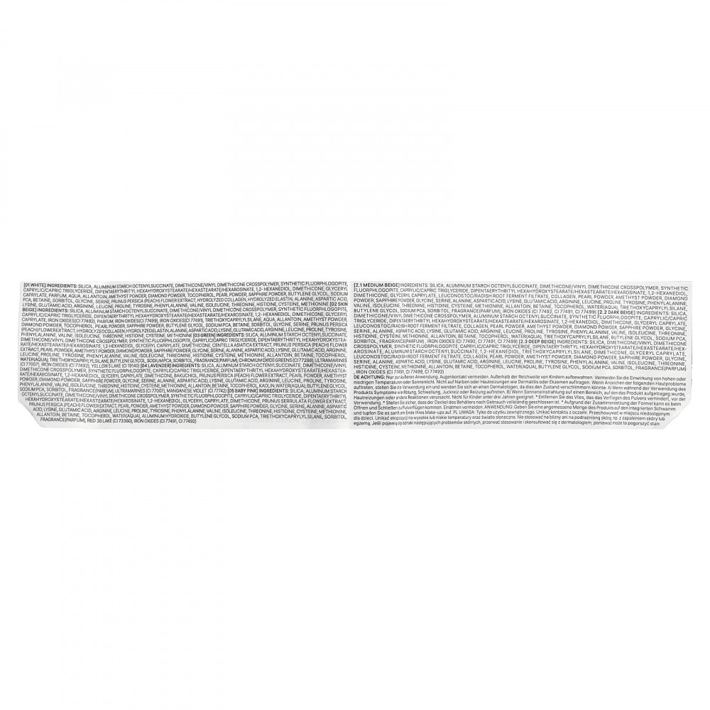 Диоксид кремния, алюминия крахмал октенилсукцинат. диметикон/винил диметикон кроссполимер, синтетический фторфлогопит, каприловый/каприновый триглицерид, дипентаэритритил гексагидроксистеорат/гексастерат/гексаросинат, 1,2-гександиол, глицерил каприлат, диметикон, экстракт готу колы (Centella asiatica), экстракт цветков персика (Prunus persica), жемчужный порошок, аметистовый порошок, алмазный порошок, сапфировый порошок, глицин, серин, аланин, аспарагиновая кислота, лизин, глутаминовая кислота, аргинин и лейцин, пролин, тирозин, фенилаланин, валин, изолейцин, треонин, гистидин, цистеин, метионина, аллантоин, бетаин, токоферол, вода, триэтоксикаприлилсилан, бутиленгликоль, натрия пирролидонкарбонат, сорбитол, отдушка, зелень с оксидом хрома (CI77288), ультрамарины (CI 77007), оксиды железа (CI 77492), лак желтый 5 (CI 19140).