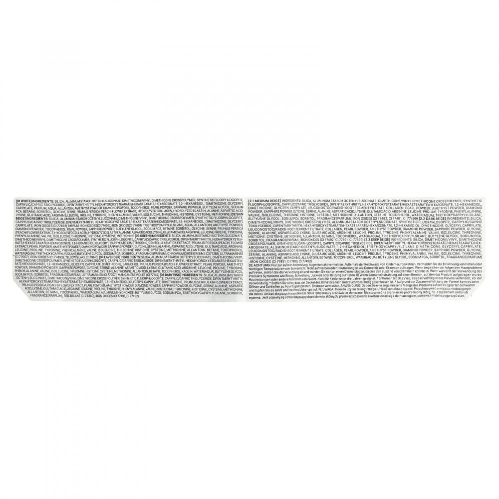 Диоксид кремния, алюминия крахмал октенилсукцинат, диметикон/винил диметикон кроссполимер, синтетический фторфлогопит, каприловый/каприновый триглицерид, дипентаэритритил гексагидроксистеорат/гексастерат/гексаросинат, 1,2-гександиол, диметикон, глицерил каприлат, оксиды железа (CI 77492), отдушка, оксиды железа (CI 77499), оксид железа (CI 77491), триэтоксикаприлилсилан, вода (Aqua), аллантоин, аметистовый порошок, алмазный порошок, токоферол, жемчужный порошок, сапфировый порошок, бутиленгликоль, натрия пирролидонкарбонат, бетаин, сорбитол, глицин, серин, экстракт цветков персика (Prunus persica), гидролизованный коллаген, гидролизованный эластин, аланин, аспарагиновая кислота, лизин, глутаминовая кислота, аргинин, лейцин, пролин, тирозин, фенилаланин, валин, изолейцин, треонин, гистидин, цистеин, метионин.