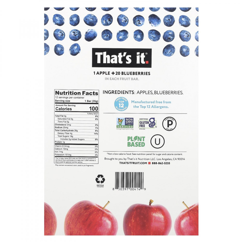Содержит две порции фруктов: 20 ягод голубики, 1 яблоко и ничего больше. Ингредиенты еще никогда не были такими простыми и чистыми. Наши фруктовые батончики на 100% натуральные, растительные, не содержат глютена, ГМО, аллергенов и добавленного сахара.