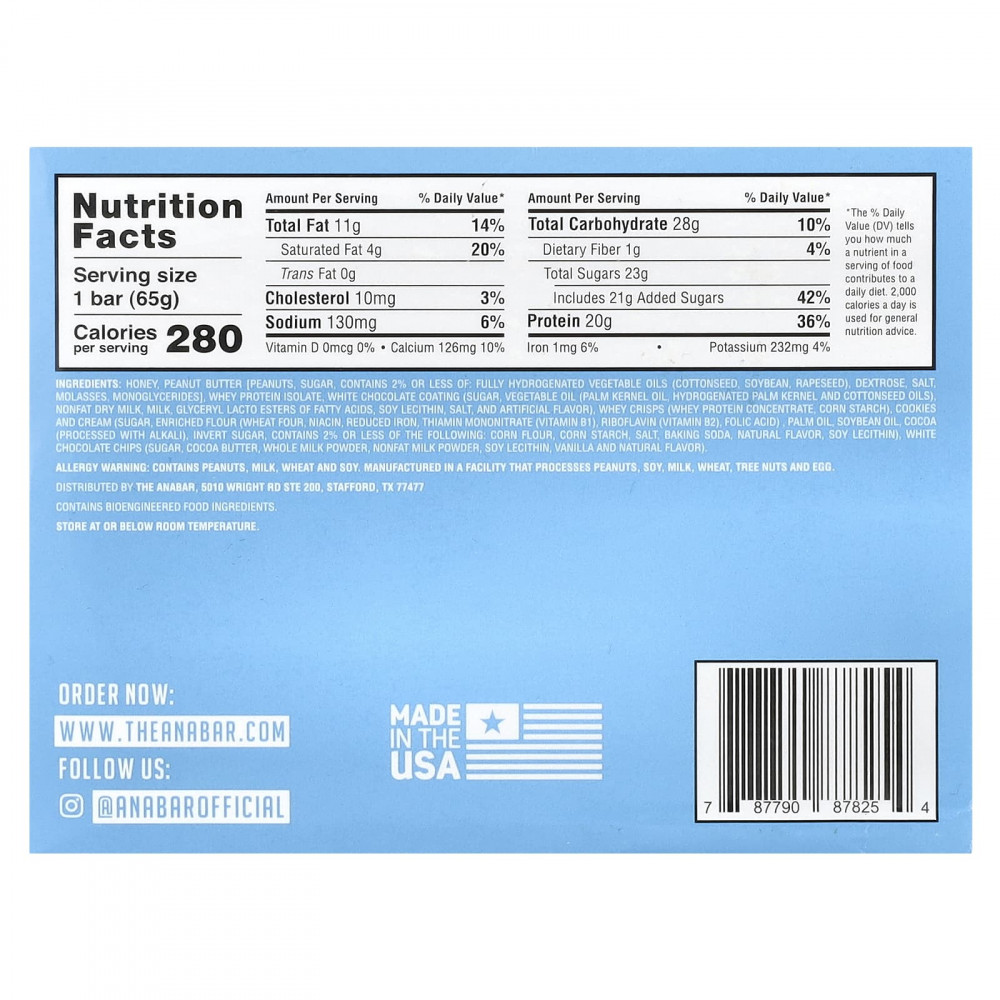 Мёд, арахисовая паста [арахис, сахар, содержит менее 2%: полностью гидрогенизированных растительных масел (хлопковое, соя, рапс), декстроза, соль, патока, моноглицериды], изолят сывороточного протеина, глазурь из белого шоколада (сахар, растительное масло (пальмоядровое масло, гидрогенизированное пальмоядровое и хлопковое масла), обезжиренное сухое молоко, молока, глицерил лактоэфиры жирных кислот, соевый лецитин, соль, искусственных ароматизаторов), чипсы (концентрат сывороточного протеина, кукурузный крахмал), печенье и сливки (сахар, обогащенная мука (пшеничная 4, ниацин, восстановленное железо, мононитрат тиамина (витамин B1), рибофлавин (витамин B2), фолиевая кислота) , пальмовое масло, соевое масло, какао (обработанное щёлочью), инвертный сахар, содержит не более 2% следующих ингредиентов: кукурузная мука, кукурузный крахмал, соль, пищевая сода, натуральный ароматизатор, соевый лецитин), кусочки белого шоколада (сахар, какао-масло, порошок из цельного молока, сухое обезжиренное молоко, соевый лецитин, ваниль и натуральный ароматизатор).