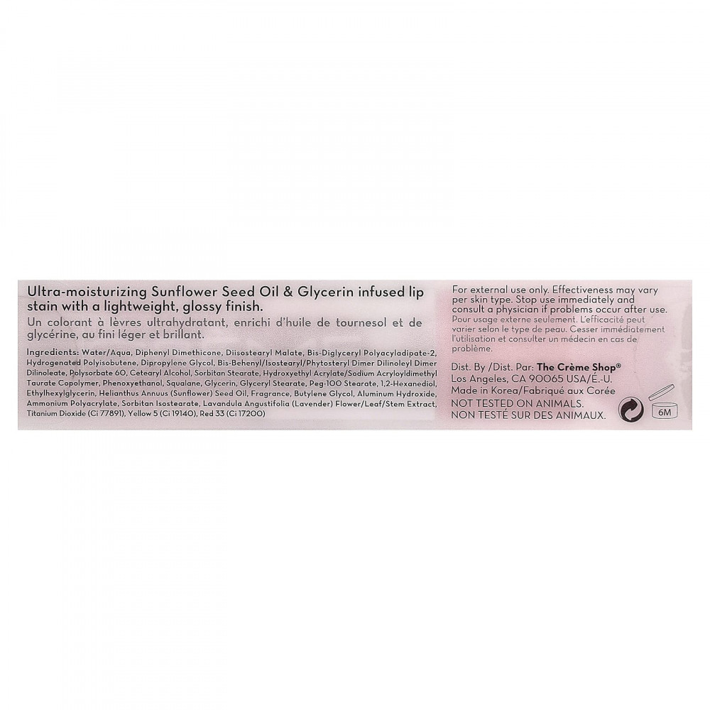 Ультраувлажняющий краситель для губ, содержащий подсолнечное масло и глицерин, с легким глянцевым финишем.