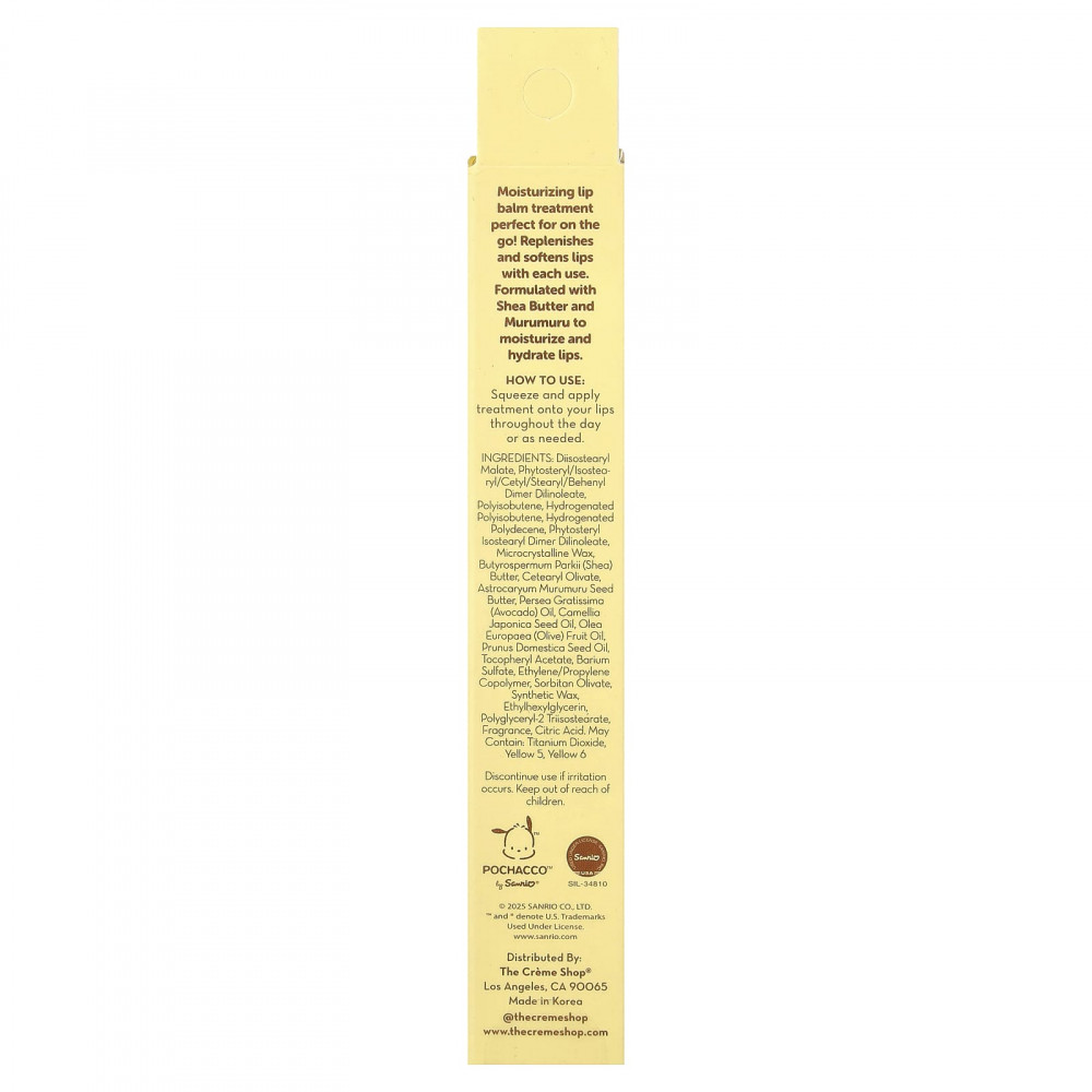 Диизостеарил малат, фитостерил / изостеарил / цетил / стеарил / бегенил димер дилинолеат, полиизобутен, гидрогенизированный полиизобутен, гидрогенизированный полидецен, фитостерил изостеарил димер дилинолеат, микрокристаллический воск, масло ши (Butyrospermum parkii), цетеарил оливат, масло семян мурумуру (Astrocaryum murumuru), масло авокадо (Persea gratissima), масло из семян камелии японской (Camellia japonica), оливковое масло (Olea europaea), масло из сливовых косточек (Prunus domestica), токоферилацетат, сульфат бария, сополимер этилена/пропилена, сорбитан оливат, синтетический воск, этилгексилглицерин, полиглицерил-2 триизостеарат, отдушка, лимонная кислота, может содержать диоксид титана, краситель желтый 5, краситель желтый 6.