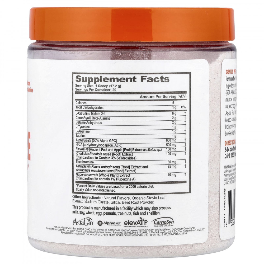 Genius Pre - это предтренировочный комплекс без стимуляторов и ноотропов, который поможет вам полностью раскрыть свой потенциал. Содержит ингредиенты, которые способствуют укреплению связи между мышцами, включая AlphaSize® (50% Alpha GPC) для повышения концентрации внимания, L-цитруллин малат для поддержки мышечной накачки, выносливости и восстановления, бета-аланин Carnosyn® для повышения спортивных результатов и Экстракт древнего торфа и яблока ElevATP® для поддержания естественной энергии. Эта мощная формула также не содержит кофеина, чтобы избежать дрожи и нарушений сна, поэтому вы можете тренироваться с Genius Pre в любое время дня! Благодаря поддержке Genius Pre в тренажерном зале вы добьетесь реальных результатов!