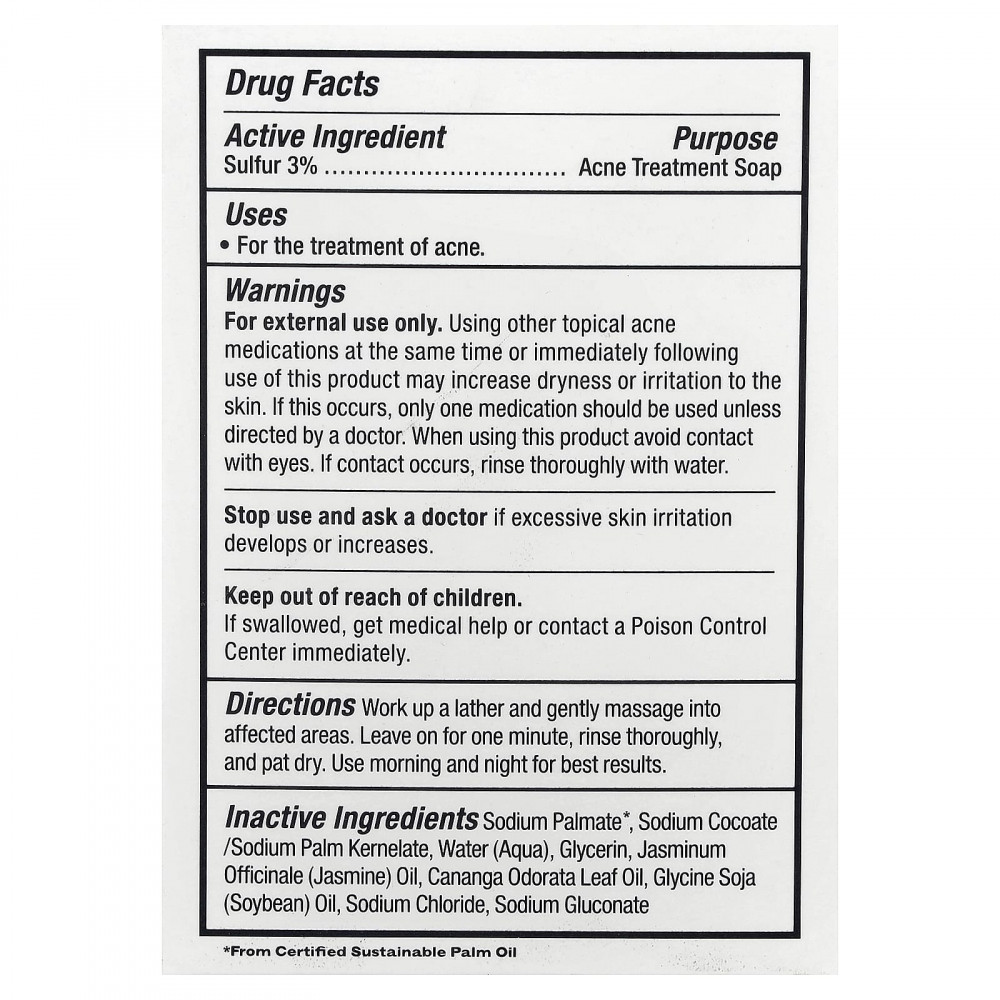 Это лечебное мыло, идеально подходящее для кожи, склонной к акне и воспалениям, использует целебные свойства натуральной серы для предотвращения и устранения высыпаний, черных точек и излишков жира.