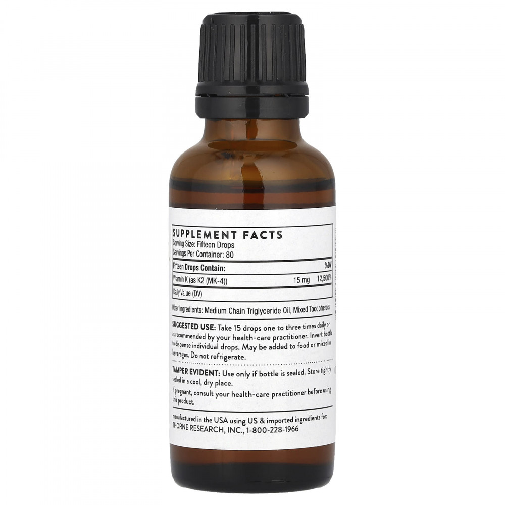 Витамин K2 обладает важными преимуществами для здоровья костей, более значимыми, чем витамин K1. Несмотря на то, что витамин K2 оказывает мощную поддержку состоянию костей в период постменопаузы благодаря отсутствию влияния эстрогенов, он также полезен и и другим группам населения, включая лиц, страдающих анорексией, проходящих процедуру диализа, лиц с болезнью Паркинсона, циррозом печени, тем, кто прошел трансплантацию костного мозга, не может двигаться после инсульта и получающим непрерывную стероидную терапию. Витамин K2 также способствует здоровью сердца и кровеносных сосудов. Витамин К2 от Thorne содержит 1 мг витамина К2 в одной капле. Исследованиями доказано, что 15 мг три раза в день являются безопасной дозой. Концентрированная жидкость и диспенсер с дозатором делают применение простым и удобным.