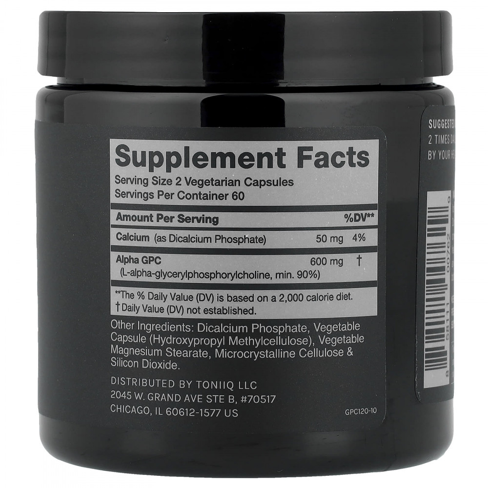 Капсулы Toniiq Alpha GPC содержат 600 мг альфа-ГФХ высочайшего качества в каждой порции. Наша альфа-ГФХ содержит беспрецедентную чистоту — более 90% (большинство продуктов с альфа-ГФХ и холином содержат менее 50%).