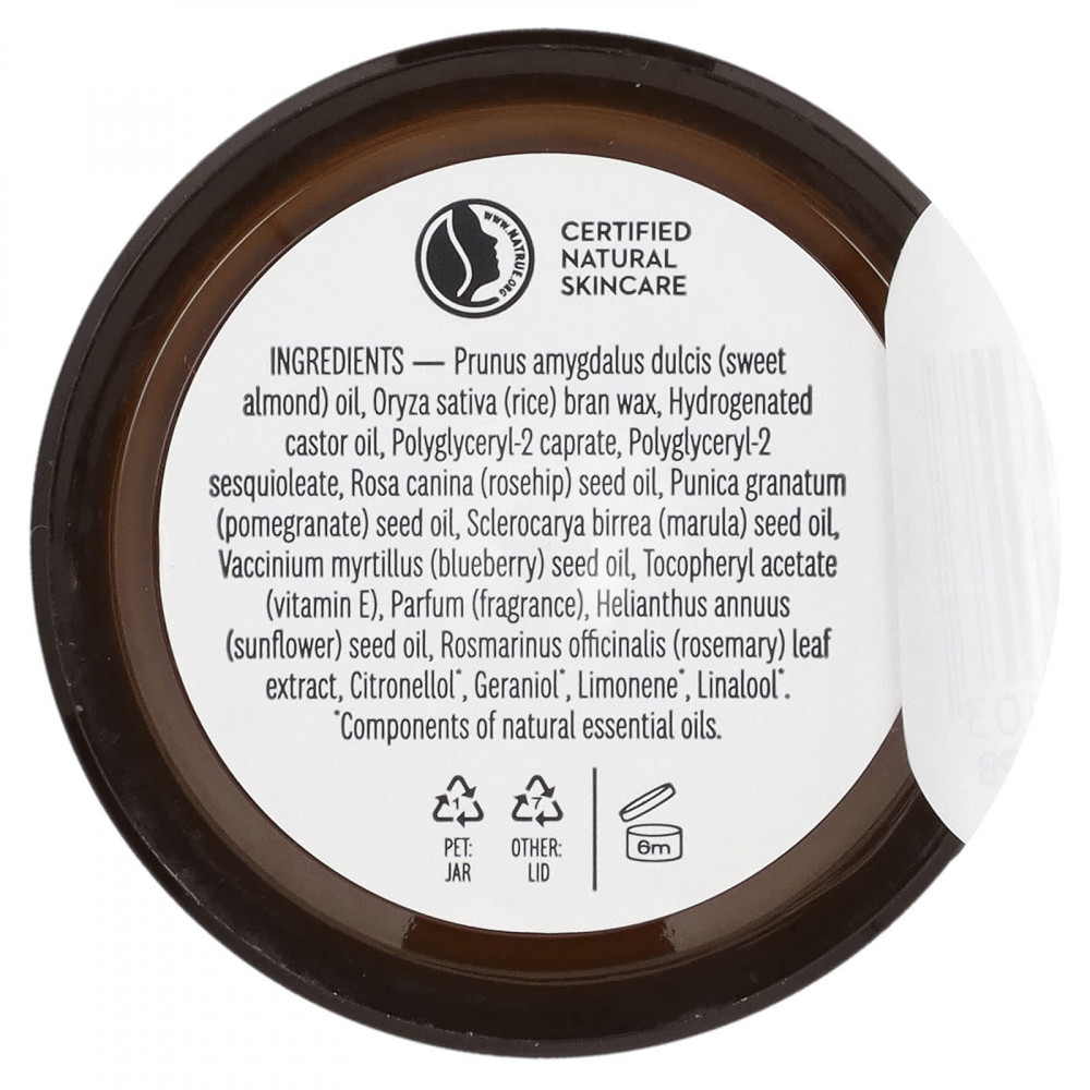 Масло сладкого миндаля (Prunus amygdalus dulcis), воск из рисовых отрубей (Oryza sativa), гидрогенизированное касторовое масло, полиглицерил-2 капрат, полиглицерил-2 сесквиолеат, масло из семян шиповника (Rosa canina), масло из косточек граната (Punica granatum), масло семян марулы (Sclerocarya birrea), масло из семян голубики (Vaccinium myrtillus), токоферилацетат (витамин Е), парфюмерная композиция (отдушка), подсолнечное масло (Helianthus annuus), экстракт листьев розмарина (Rosmarinus officinalis), цитронеллол*, гераниол*, лимонен*, линалоол*.