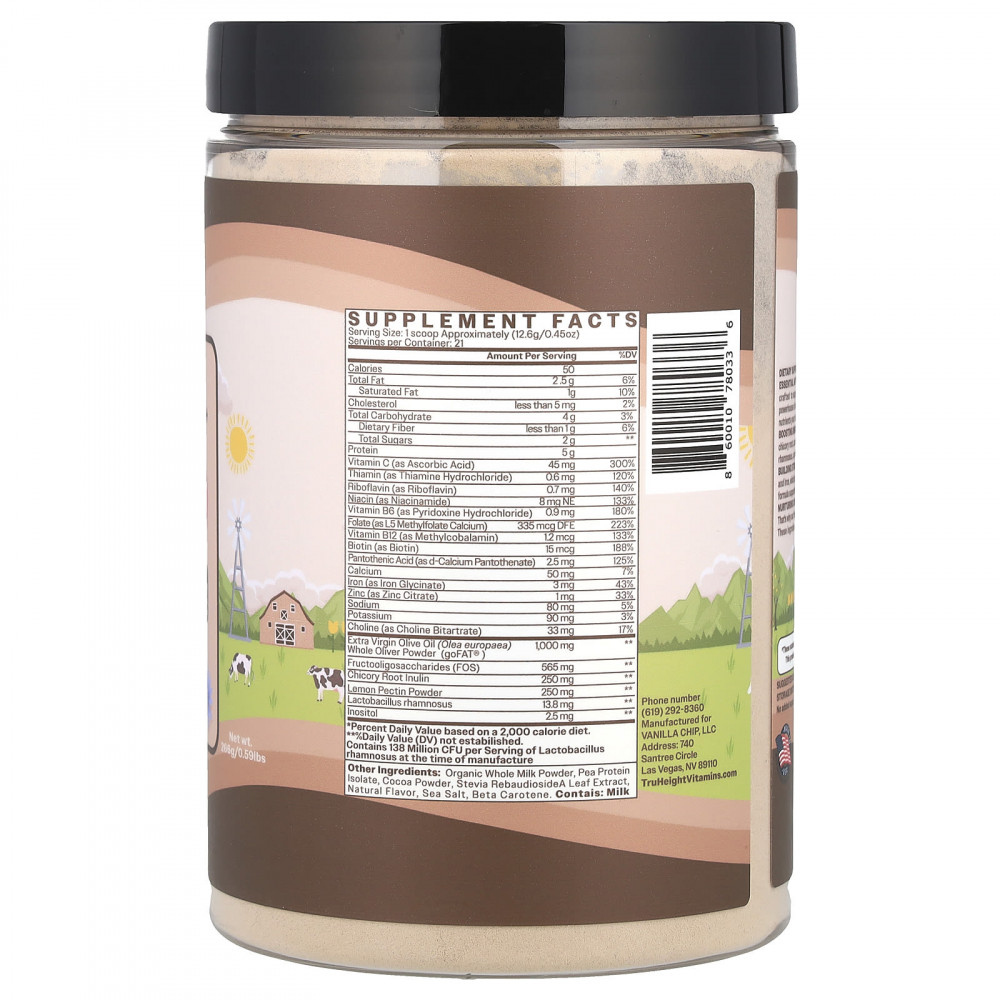 Органическое цельное сухое молоко, изолят горохового белка, какао-порошок, экстракт листьев стевии (ребаудиозид M), натуральный ароматизатор, морская соль, бета-каротин.