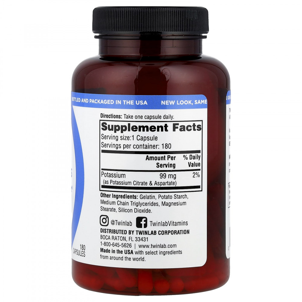 Капсулы для калия Twinlab® содержат 99 мг калия из цитрата калия и аспартата калия. Калий, являющийся электролитом, поддерживает нормальную работу всех клеток, органов и тканей организма. Он способствует здоровой сердечной деятельности, а также здоровью скелета и сокращению гладких мышц, что делает его важным для нормальной работы мышц и пищеварительной системы.