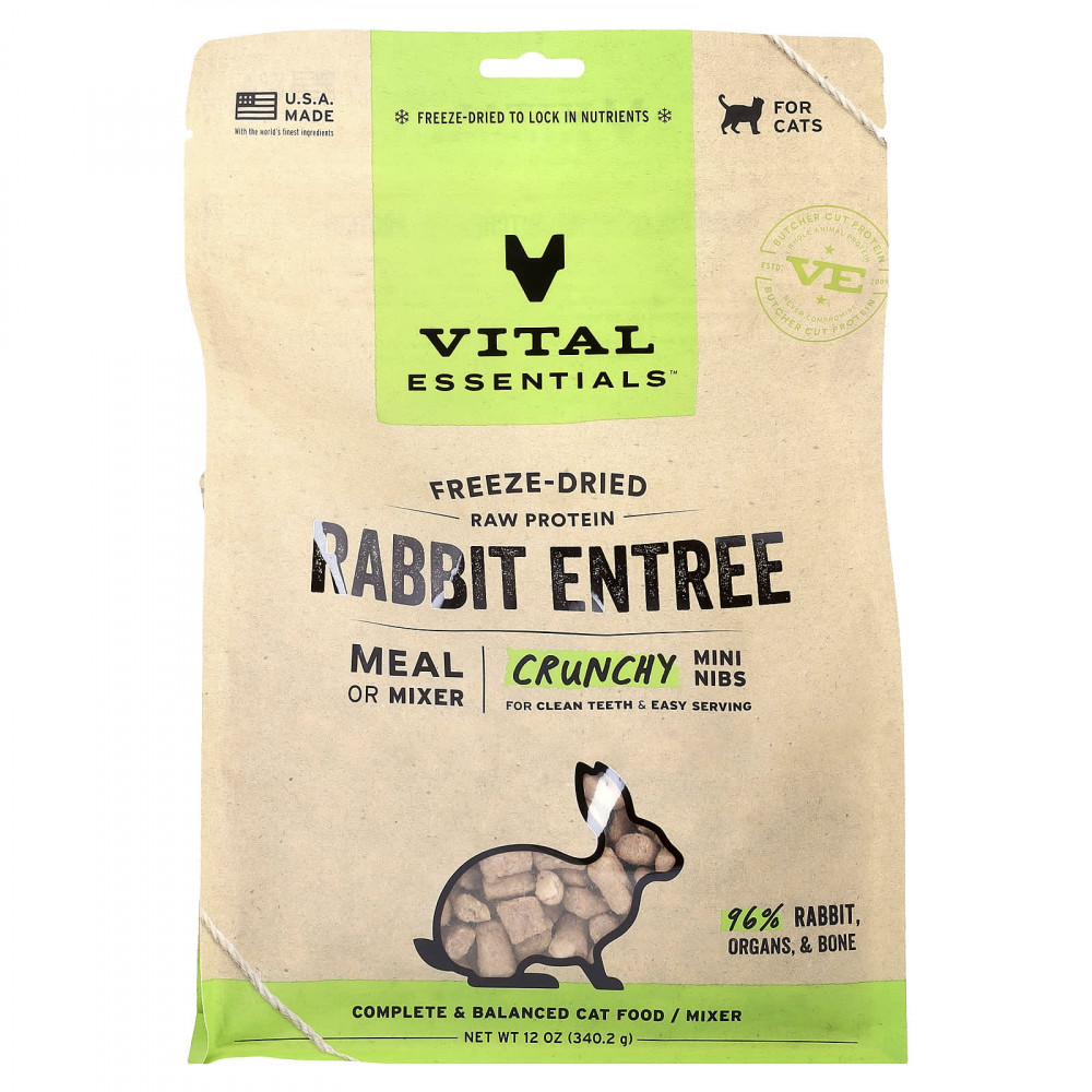 Хрустящие мини-бобы из сублимированных сырых протеиновых кроличьих блюд Vital Essentials™ соответствуют уровням питательных веществ, установленным ассоциацией AAFCO для питательных веществ кормов для кошек на всех этапах жизни.