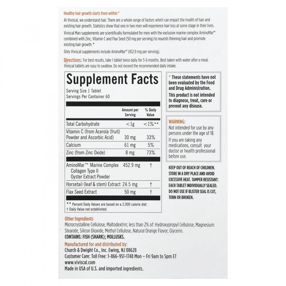Компания Viviscal разбирается в волосах. Существует целый ряд факторов, которые могут повлиять на здоровье волос и их рост. По статистике, каждый второй мужчина на том или ином этапе своей жизни сталкивается с выпадением волос. Добавки Viviscal разработаны на основе научных исследований для мужчин. Они содержат эксклюзивный морской комплекс AminoMar™, цинк, витамин С и семена льна (50 мг в 1 порции), которые питают истончённые волосы и способствуют их росту.