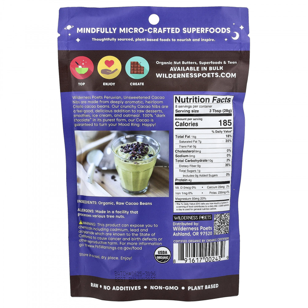 Неподслащенные ядра какао-боба Wilderness Poets из Перу изготовлены из традиционных ароматных какао-бобов криолло. Это 100% "темный шоколад" в чистейшей форме. Наше какао гарантированно подарит вам хорошее настроение!