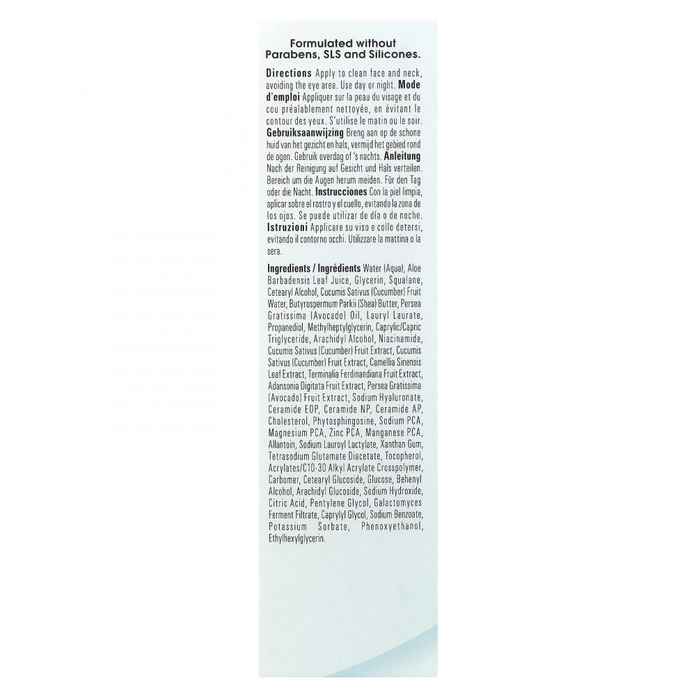 Вода (Aqua), сок из листьев алоэ вера (Aloe barbadensis), глицерин, сквалан, цетеариловый спирт, огуречная вода (Cucumis sativus), масло ши (Butyrospermum parkii), масло авокадо (Persea gratissima), лаурил лаурат, пропандиол, метилгептилглицерин, каприловый/каприновый триглицерид, арахидиловый спирт, никотинамид, экстракт плодов огурца (Cucumis sativus), экстракт плодов огурца (Cucumis sativus), экстракт листьев зеленого чая (Camellia sinensis), экстракт плодов сливы какаду (Terminalia ferdinandiana), экстракт плодов баобаба (Adansonia digitata), экстракт плодов авокадо (Persea gratissima), гиалуронат натрия, керамид EOP, керамид NP, керамид ап холестерин, фитосфингозин, натрия пирролидонкарбонат, магний pca, цинк PCA, марганец, аллантоин, натрия лауроил лактилат, ксантановая камедь, диацетат глутамата тетранатрия, токоферол, акрилат/c10-30 алкил акрилат кроссполимер, карбомер, цетеариловый глюкозид, глюкоза, бегениловый спирт, арахидиловый глюкозид, гидроксид натрия, лимонная кислота, пентилен гликоль, ферментированный фильтрат галактомицетов, каприлилгликоль, бензоат натрия, сорбат калия, феноксиэтанол, этилгексилглицерин.