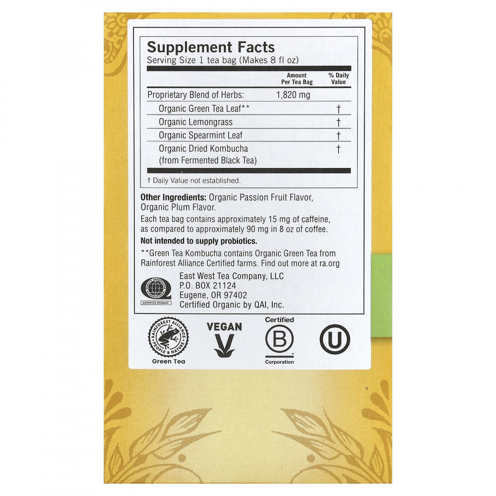 Эта восхитительная смесь зелёного чая и сушёной комбучи содержит антиоксиданты, поддерживающие общее состояние здоровья. Ароматы мяты и лемонграсса, сливы и маракуйи гармонично сочетаются, образуя приятный фруктовый вкус. Наслаждайтесь оригинальным, приятным вкусом зелёного чая комбуча.