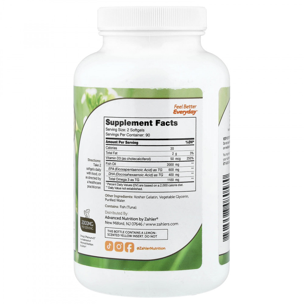 омега-3 — незаменимые жирные кислоты; необходимы, поскольку организм требует их, но не может производить самостоятельно. Добавка Omega 3 Platinum+D™ от Zahler содержит значительную дозу витамина D3 и жирные кислоты омега-3, полученные из тунца, для поддержания здоровья мозга и сердца, а также общего состояния здоровья и хорошего самочувствия.