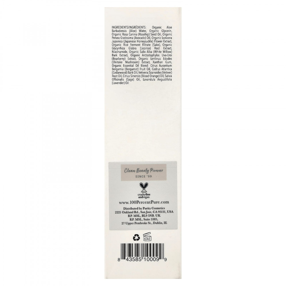 Органическая вода алоэ вера (Aloe barbadensis), органический глицерин, органическое масло из семян шиповника (Rosa canina), органическое масло авокадо (Persea gratissima), органический экстракт цветков жимолости японской (Lonicera japonica), органический ферментированный фильтрат риса (саке), органический экстракт корня солодки (Glycyrrhiza glabra), Ниацинамид, экстракт органической коры белой ивы (Salix alba), органический экстракт толокнянки (Arctostaphylos uva-ursi), экстракт органического гриба шиитаке (Lentinus edodes), Ксантановая камедь, смесь органических эфирных масел: масло бергамота (Citrus aurantium bergamia), масло коры кедра атласского (Cedrus atlantica), масло из корня ветивера (Vetivera zizanoides), масло красного апельсина (Citrus sinensis), масло шалфея (Salvia officinalis), лавандовое масло (Lavandula angustifolia).