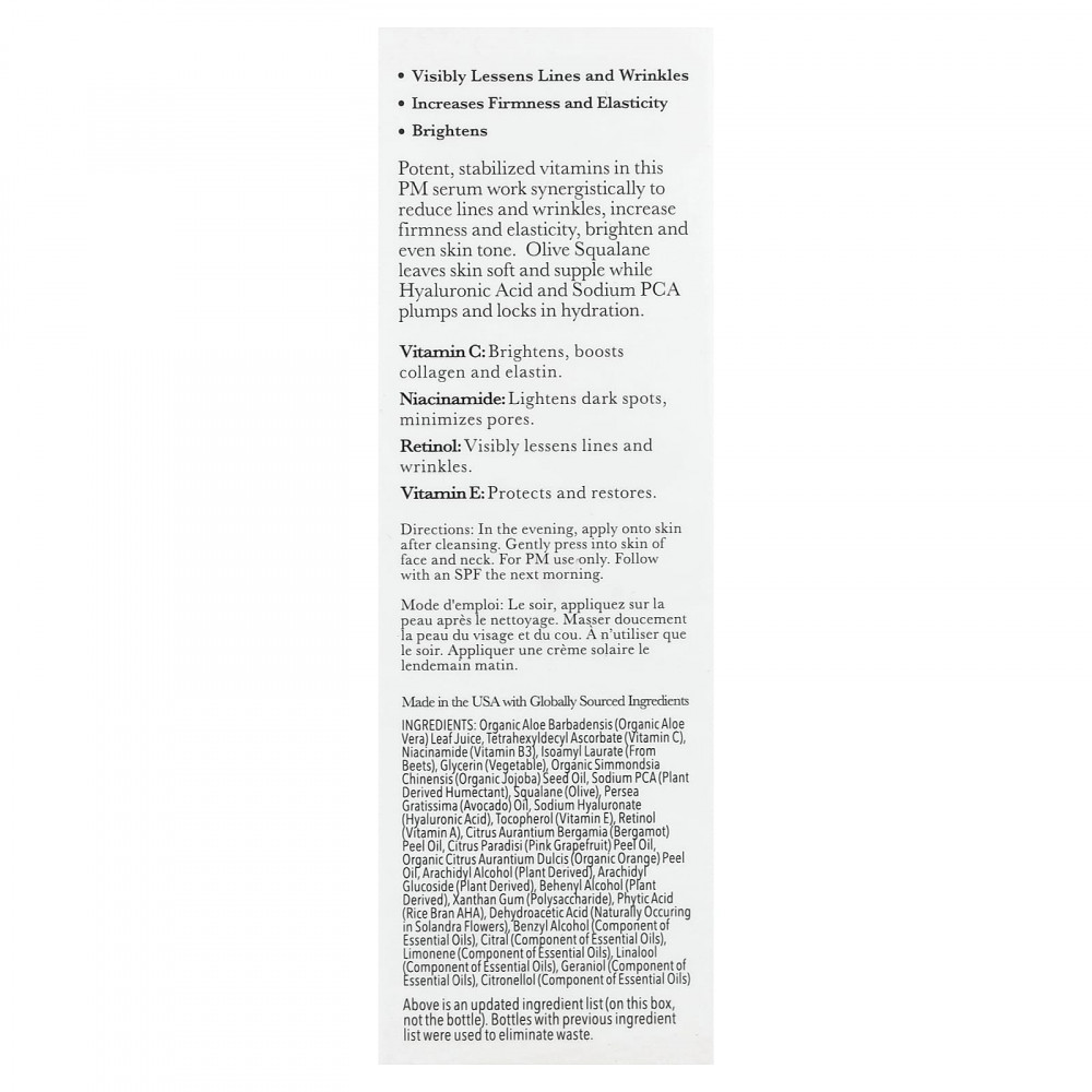 Мощные стабилизированные витамины в этой сыворотке PM работают синергетически, сокращая количество морщин, повышая упругость и эластичность, осветляя и выравнивая тон кожи. Оливковый сквалан делает кожу мягкой и эластичной, а гиалуроновая кислота и натрий пирролидонкарбонат разглаживают и удерживают влагу.