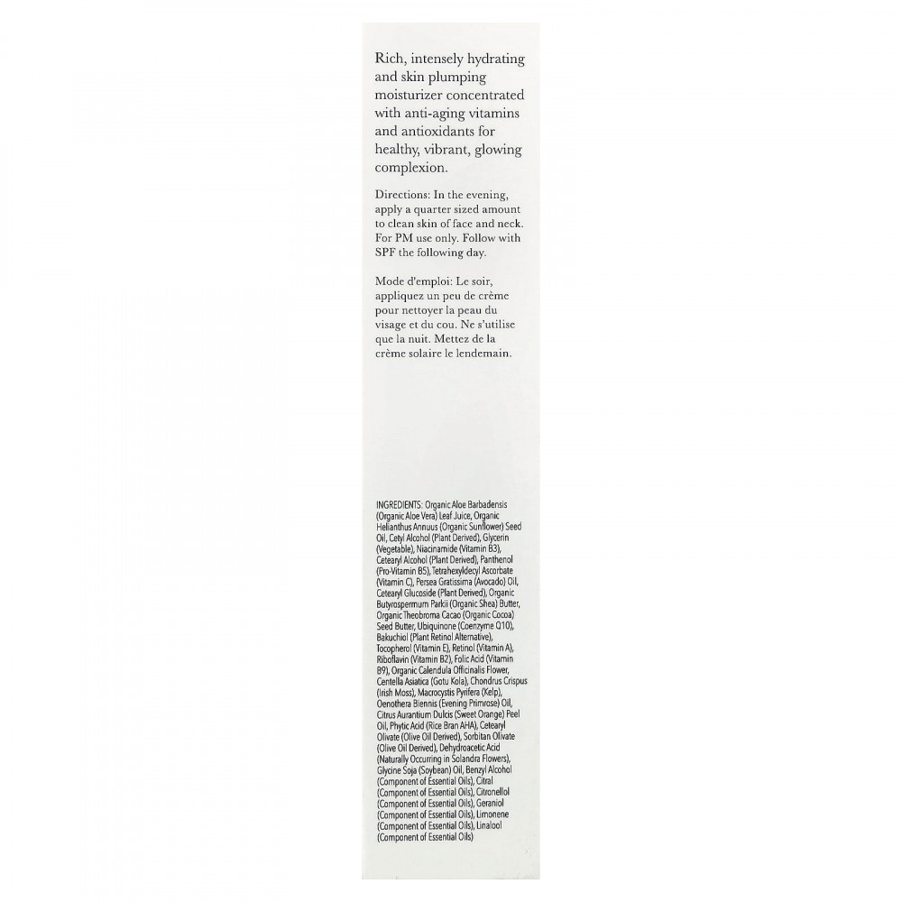 сок листьев органического алоэ вера (Aloe barbadensis), органическое подсолнечное масло (Helianthus annuus), цетиловый спирт (растительного происхождения), глицерин (растительный), никотинамид (витамин B3), цетеариловый спирт (растительного происхождения), пантенол (провитамин B5), тетрагексилдецил аскорбат (витамин C), масло авокадо (Persea gratissima), цетеариловый глюкозид (растительного происхождения), органическое масло ши (Butyrospermum parkii), органическое масло зерен какао (Theobroma cacao), убихинон (коэнзим Q10), бакучиол (растительная альтернатива ретинолу), токоферол (витамин E), ретинол (витамин A), рибофлавин (витамин B2), фолиевая кислота (витамин B9), органические цветки календулы (Calendula officinalis), готу кола (Centella asiatica), ирландский мох (Сhondrus crispus), морской водоросли (Macrocystis pyrifera), масло примулы вечерней (Oenothera biennis), масло из цедры сладкого апельсина (Citrus aurantium dulcis), фитиновая кислота (рисовые отруби), цетеарил оливат (из оливкового масла), сорбитан оливат (из оливкового масла), дегидроуксусная кислота (в природе содержится в цветках соландры), Глицин соевое (соевое) масло, бензиловый спирт (компонент эфирных масел), цитраль (компонент из эфирных масел), цитронеллол (компонент из эфирных масел), гераниол (компонент эфирных масел), лимонен (компонент эфирных масел), линалоол (компонент эфирных масел).