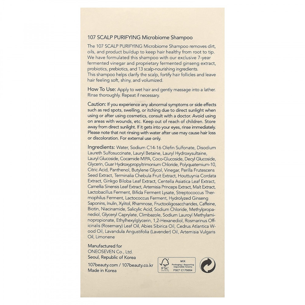 Шампунь 107 для очищения микробиома кожи головы удаляет грязь, жир и загрязнения, сохраняя здоровье волос от корней до кончиков. Мы создали этот шампунь на основе эксклюзивных ферментированных в течение 7 лет уксуса и запатентованного экстракта ферментированного женьшеня, пробиотиков, пребиотиков и 13 питательных ингредиентов для кожи головы. Этот шампунь очищает кожу головы, укрепляет волосяные фолликулы и делает волосы мягкими, блестящими и объемными.
