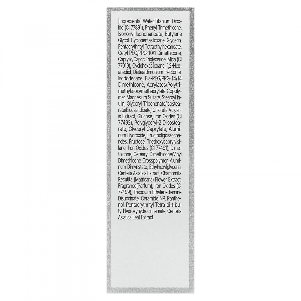 Вода, диоксид титана (CI 77891), фенилтриметикон, изононил изононаноат, бутиленгликоль, циклопентасилоксан, глицерин, пентаэритритил тетраэтилгексаноат, цетил ПЭГ/ППГ-10/1 диметикон, каприловый/каприновый триглицерид, слюда (CI 77019), циклогексасилоксан, 1,2-гександиол, дистеардимония гекторит изододекан, бис-ПЭГ/ППГ-14/14 диметикон, акрилаты/политриметилсилоксиметакрилат сополимер, сульфат магния, стеароил инулин, глицерил трибегенат/изостеарат/эйкозандиоат, экстракт хлореллы (Chlorella vulgaris), глюкоза, оксиды железа (CI 77492), полиглицерил-2 диизостеарат, глицерил каприлат, гидроксид алюминия, фруктоолигосахариды, фруктоза, триэтоксикаприлилсилан, оксиды железа (CI 77491), диметикон, цетеарил диметикон/винил диметикон кроссполимер, димиристат алюминия, этилгексилглицерин, экстракт готу колы (Centella asiatica), экстракт цветков ромашки лекарственной (Chamomilla recutita), отдушка (парфюмерная композиция), оксиды железа (CI 77499), тринатрия этилендиамин дисукцинат, керамид NP, пантенол, пентаэритритил тетра-ди-трет-бу-тил гидроксигидроциннамат, экстракт листьев готу колы (Centella asiatica).