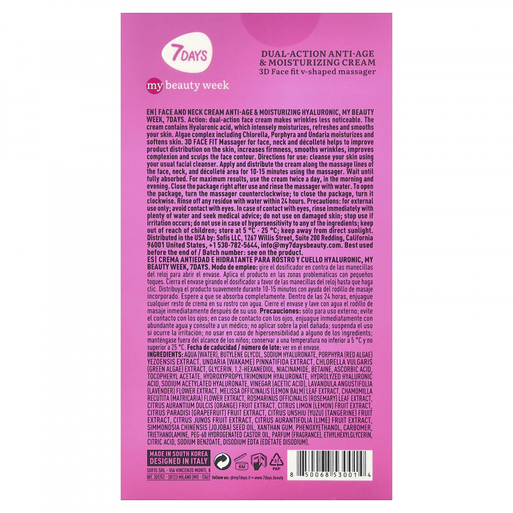 Действие: Крем для лица двойного действия делает морщины менее заметными.Крем содержит гиалуроновую кислоту, которая интенсивно увлажняет, освежает и разглаживает кожу.Комплекс водорослей, включая хлореллу, порфиру и ундарию, увлажняет и смягчает кожу.Массажер 3D FACE FIT для лица, шеи и области декольте помогает улучшить распределение продукта на коже, повышает упругость, разглаживает морщины, улучшает цвет лица и повторяет контуры лица.