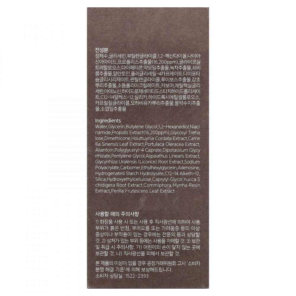 Вода, глицерин, бутиленгликоль, 1,2-гександиол, Ниацинамид, экстракт прополиса (16 200 част./млн), гликозил трегалоза, диметикон, экстракт хауттюйнии (Houttuynia cordata), Экстракт листьев камелии китайской, экстракт портулака огородного, Аллантоин, полиглицерил-4 капрат, глицирризат дикалия, пентиленгликоль, экстракт ройбуша (Aspalathus linearis). экстракт корня солодки уральской (Glycyrrhiza uralensis), полиакрилат натрия, Карбомер, этилгексилглицерин, аденозин, гидролизат гидрогенизированного крахмала, c12-14 алкет-12, кремнезем, гидроксиэтилцеллюлоза, каприлилгликоль, экстракт корня юкки Шидигера (Yucca schidigera), экстракт камеди коммифоры мирровой (Commiphora myrrha), экстракт листьев периллы (Perilla ocymoides)