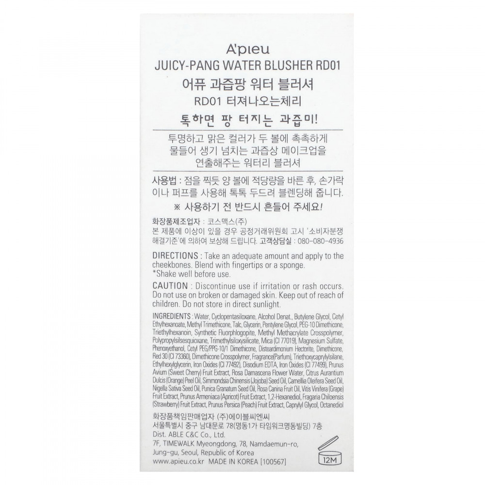 Вода, циклопентасилоксан, денатурированный спирт, бутиленгликоль, цетилэтилгексаноат, метилтриметикон, тальк, глицерин, пентилен гликоль, ПЭГ-10 диметикон, триэтилгексаноин, синтетический фторфлогопит, метил метакрилат кроссполимер, полипропилсилсесквиоксан, триметилсилоксисиликат, слюда (CI 77019), сульфат магния, феноксиэтанол, цетил ПЭГ/ППГ-10/1 диметикон, дистеардимония гекторит, диметикон, краситель красный 30 (CI 73360), диметикон кроссполимер, отдушка (парфюмерная композиция), триэтоксикаприлилсилан, этилгексилглицерин, оксиды железа (CI 77492), двунатриевая ЭДТК, оксиды железа (CI 77499), экстракт плодов черешни (Prunus avium), вода из цветков дамасской розы (Rosa damascena), масло из цедры апельсина (Citrus aurantium dulcis), масло из семян жожоба (Simmondsia chinensis), масло из семян камелии масличной (Camellia oleifera), масло семян чернухи (Nigella sativa), масло из семян граната (Punica granatum), масло шиповника (Rosa canina), экстракт плодов винограда (Vitis vinifera), экстракт плодов абрикоса (Prunus armeniaca), 1,2-гександиол, экстракт ягод клубники (Fragaria chiloensis), экстракт персика (Prunus persica), каприлилгликоль, октандиол.