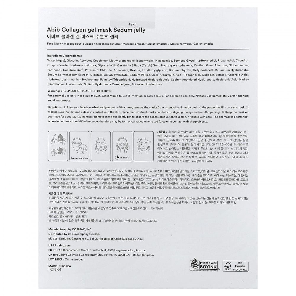 Вода (Aqua), глицерин, сополимер акрилатов, метилпропандиол, изопентилдиол, никотинамид, бутиленгликоль, 1,2-гександиол, пропандиол, порошок из ирландского мха (Chondrus crispus), гидроксиэтилированная мочевина, глицерет-26, камедь рожкового дерева (Ceratonia siliqua), гидроксиацетофенон, ксантановая камедь, аллантоин, глюкоманнан, пантенол, целлюлозная камедь, хлорид калия, аденозин, декстрин, этилгексилглицерин, фитат натрия, октилдодецет-16, гиалуронат натрия, экстракт очитка (Sedum сарmentosum), дикалия глицирризат, полиакрилат натрия, каприлилгликоль, токоферол, экстракт коллагена, аскорбиновая кислота, гиалуронат гидроксипропилтримония, пальмитоил трипептид-5, гидролизованная гиалуроновая кислота, ацетилированный гиалуронат натрия, гиалуроновая кислота, гидролизованный гиалуронат натрия, кроссполимер гиалуроната натрия, гиалуронат калия.