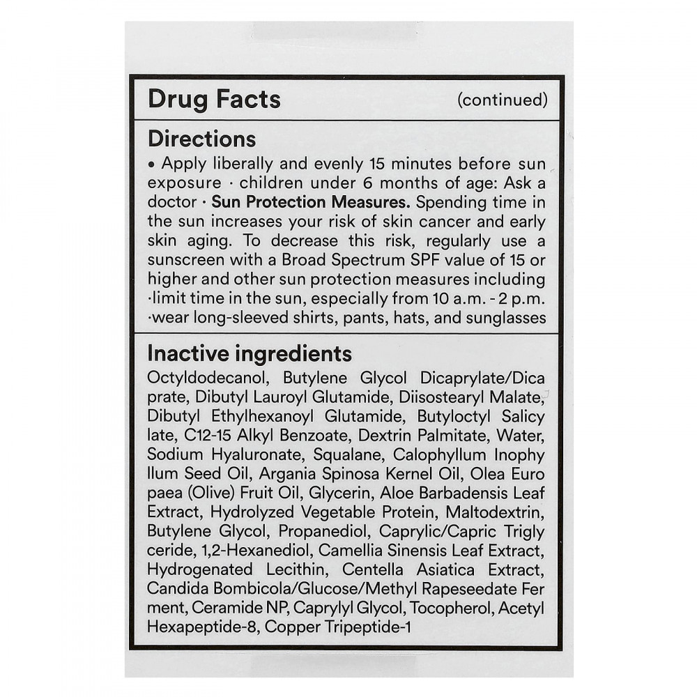 | Октилдодеканол, бутиленгликоль дикаприлат / дикапрат, дибутил лауроил глутамид, диизостеарилмалат, дибутилэтилгексаноил глутамид, бутилоктилсалицилат, c12-15 алкилбензоат, декстрин пальмитат, вода, гиалуронат натрия, масло семян арофилла спиналана масло из плодов оливы (europaea), глицерин, экстракт листьев алоэ вера, гидролизованный растительный белок, мальтодекстрин, бутиленгликоль, пропандиол, каприловый / каприновый триглицерид, 1,2-гександиол, экстракт листьев камелии китайской, гидрогенизированный лецитин, экстракт центеллы азиатской, Candida bombicola фермент / глюкоза / метил рапсидат, керамид np, каприлил гликоль, токоферол, ацетил гексапептид-8, трипептид меди-1. | |